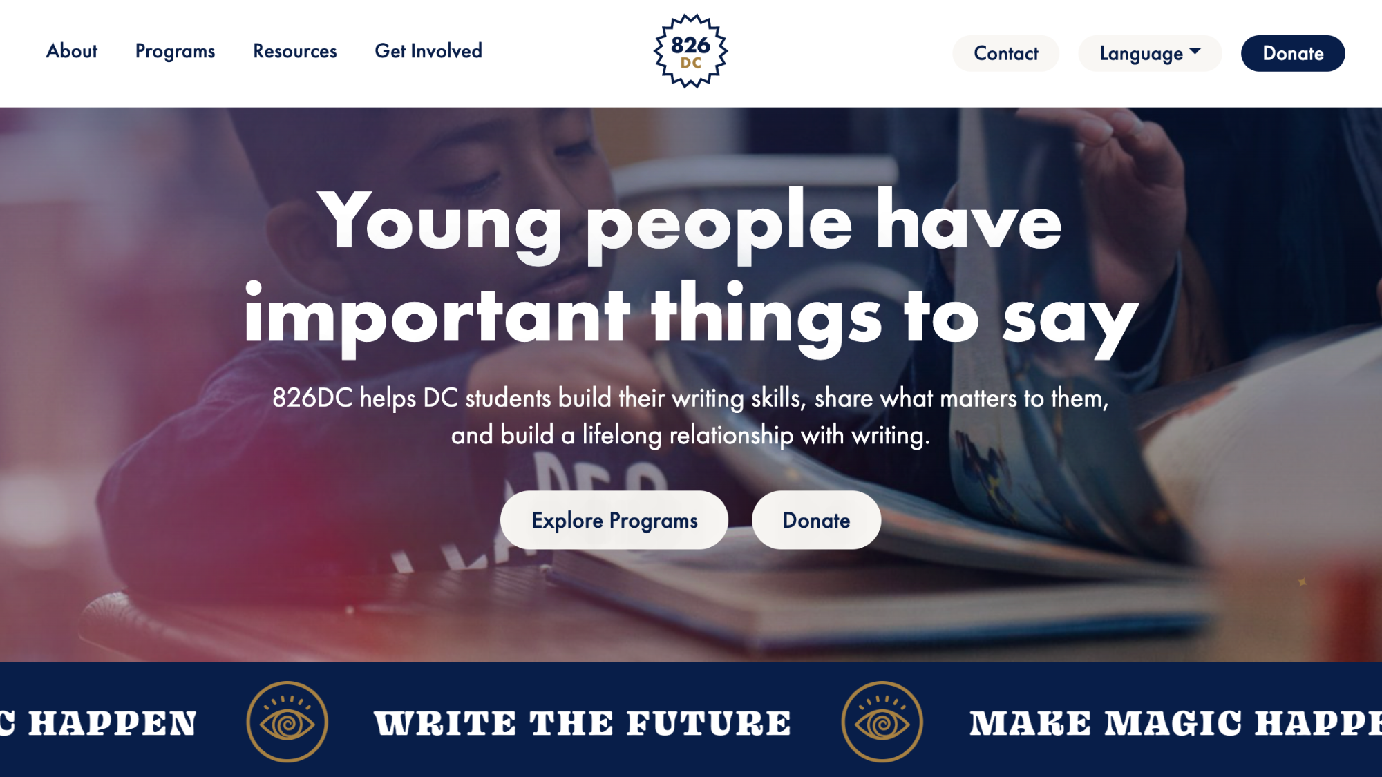 Home - 826DC Skip to content Donate to 826DC before November 30th at 11:59 PM Eastern and our board will match your gift, dollar-for-dollar! About 826DC inspires young people with the power of writing About 826DC Read more about About 826DC Student Writing Gallery Read more about Student Writing Gallery News Read more about News Meet our team of magic-makers Staff and Interns Read more about Staff and Interns Board and Advisors Read more about Board and Advisors Partners and Donors Read more about Partners and Donors Programs Free, year-round writing programs for DC students ages 6-18 See All Programs Educator Enrollment In-School Writing, Editing, and Publishing In-School Writing, Editing, and Publishing Flexible short-and long-term writing residencies in collaboration with K-12 teachers. Read more about In-School Writing, Editing, and Publishing Field Trips Field Trips Two-hour writing and bookmaking experiences for the whole c...