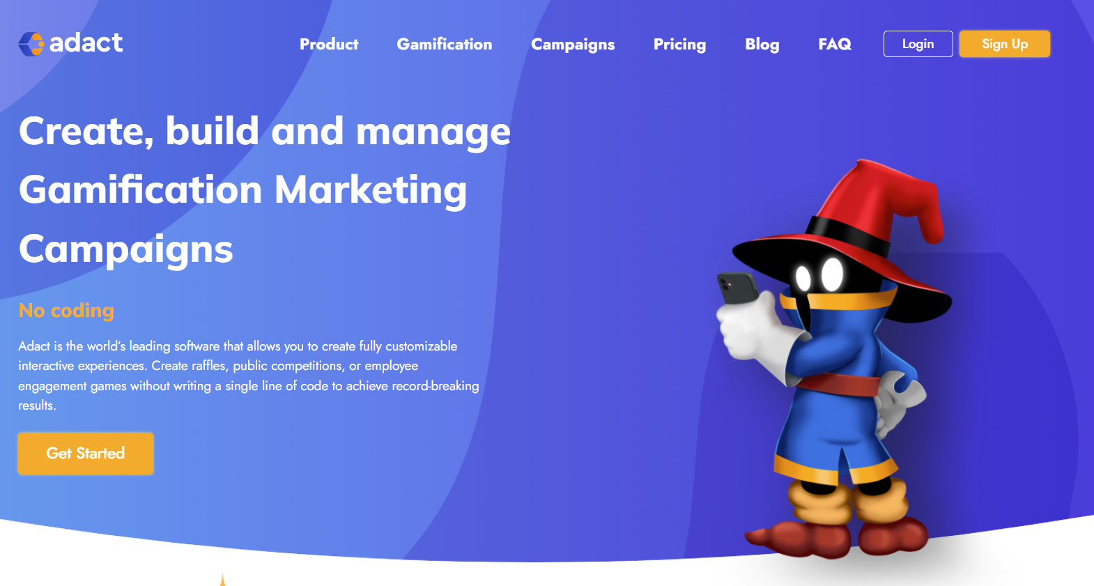 Gamification Marketing Software - No Coding with Adact Product Gamification Campaigns Pricing Blog FAQ Login Sign Up Create, build and manage Gamification Marketing Campaigns No coding Adact is the world’s leading software that allows you to create fully customizable interactive experiences. Create raffles, public competitions, or employee engagement games without writing a single line of code to achieve record-breaking results. Get Started Adact helps you to bring results with gamification marketing 95% of Campaign Completion 6+ Days of Retention 5x Higher Coupon Redemption 20+ Engagements Per Participant 5-10% Higher Click-Through-Rates 10-25% Bounce Rate Choose from over 40 unique gamification marketing campaigns Quizzes and Questionnaires Create Quizzes and Questionnaires and word guessing games to test your audience knowledge or get their feedback Competitive Games Create fully branded playable games with leader boards ...