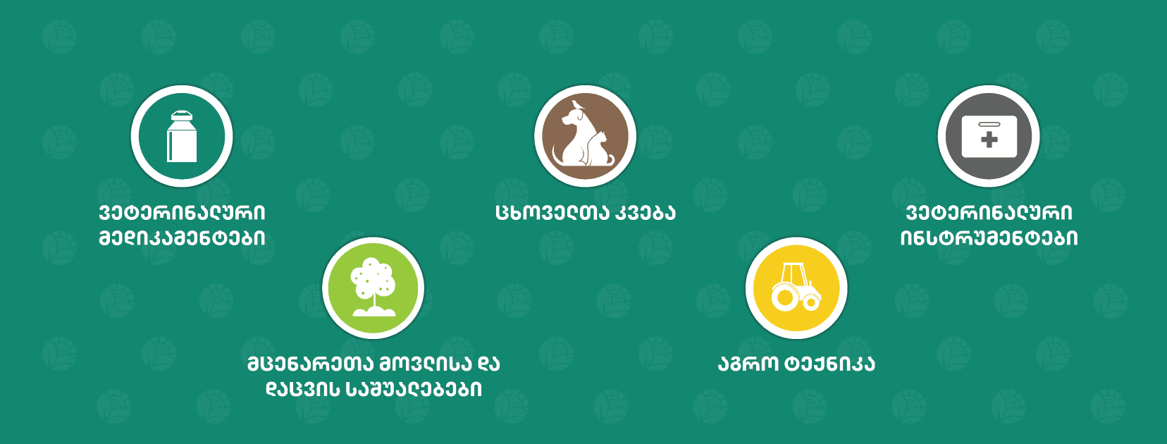 ვეტ. პრეპარატები, ძაღლის საკვები, კატის საკვები, საკვებდანამატები, მცენარეთა დაცვა, ვეტერინარული ტექნიკა და ინვენტარი,