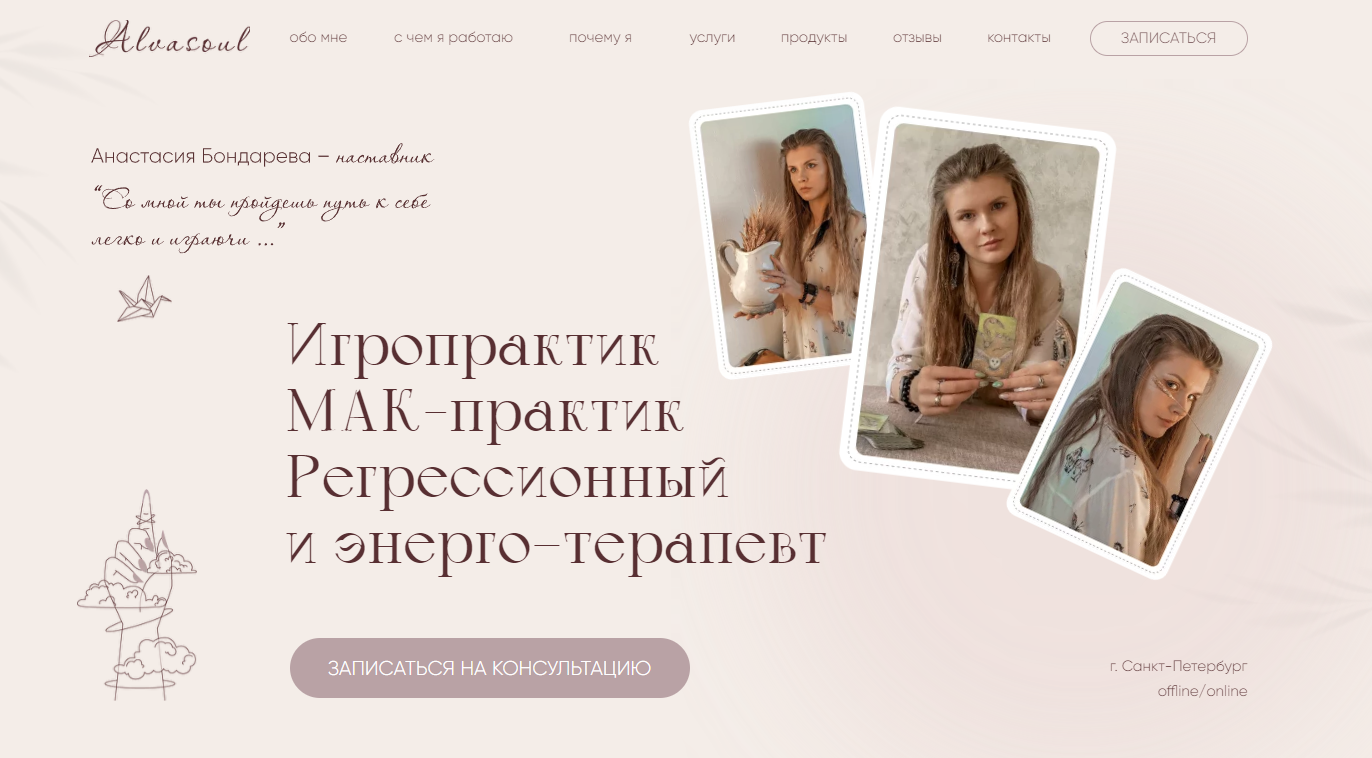 Анастасия Бондарева - Наставник, Игропрактик, МАК-практик, Регрессионный и энерго–терапевт, Психолог ЗАПИСАТЬСЯ обо мне с чем я работаю почему я услуги продукты отзывы контакты обо мне с чем я работаю почему я услуги продукты отзывы контакты Игропрактик МАК-практик Регрессионный и энерго–терапевт ЗАПИСАТЬСЯ НА КОНСУЛЬТАЦИЮ г. Санкт-Петербург offline/online ЗАПИСАТЬСЯ обо мне с чем я работаю почему я услуги продукты отзывы контакты Обо мне {более 6 лет практики} Сама себя я называю «Позитивным психологом»! Все мои инструменты способствуют легкому и игровому запуску необходимых процессов по изменению своей жизни. В глазах клиентов я: «Проводник в лучшую версию себя» «Психолог, который феячит» «Психолог – трансформатор» Ведущая невероятных трансформационных игр: Око судьбы Энергии предназначения Пробуждение женских архетипов Волшебный лес Алхимия эфиров PROЭМОЦИИ – авторская терапевтическая игра ИГРО-ПРАК...