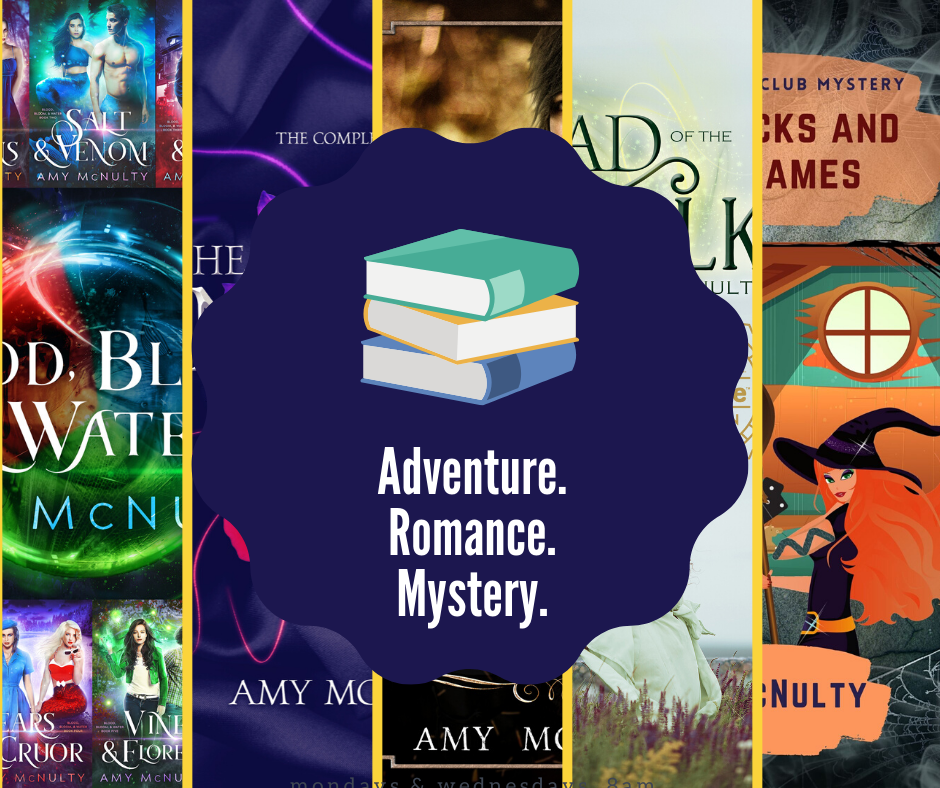 Amy McNulty – Author, editor, reader, and fangirl. Skip to content Menu Blog Books Ballad of the Beanstalk Broomsticks and Board Games (A Spooky Games Club Mystery Book One) Curses and Crosswords (A Spooky Games Club Mystery Book Four) Darken the Night Don’t Judge a Book by Its Hover (Witchy Expo Services Mysteries Book 1) Drowned Silence Enchantments and Escape Rooms (A Spooky Games Club Mystery Book Two) Fall Far from the Tree Fangs & Fins (Blood, Bloom, & Water Book One) Home Is My Zapping Place (Witchy Expo Services Mysteries Book 3) Iron & Aqua (Blood, Bloom, & Water Book Three) It’s a Nerd! Witch Is Slain! (Witchy Expo Services Mysteries Book 2) Josie’s Coat Magic at Midnight Nobody’s Goddess (The Never Veil Series Book One) Nobody’s Lady (The Never Veil Series Book Two) Nobody’s Pawn (The Never Veil Series Book Three) Potions and Playing Cards (A Spooky Games Club Mystery Book Three) Salt & Venom (Blood, Bloom, & Water Book Two) Te...