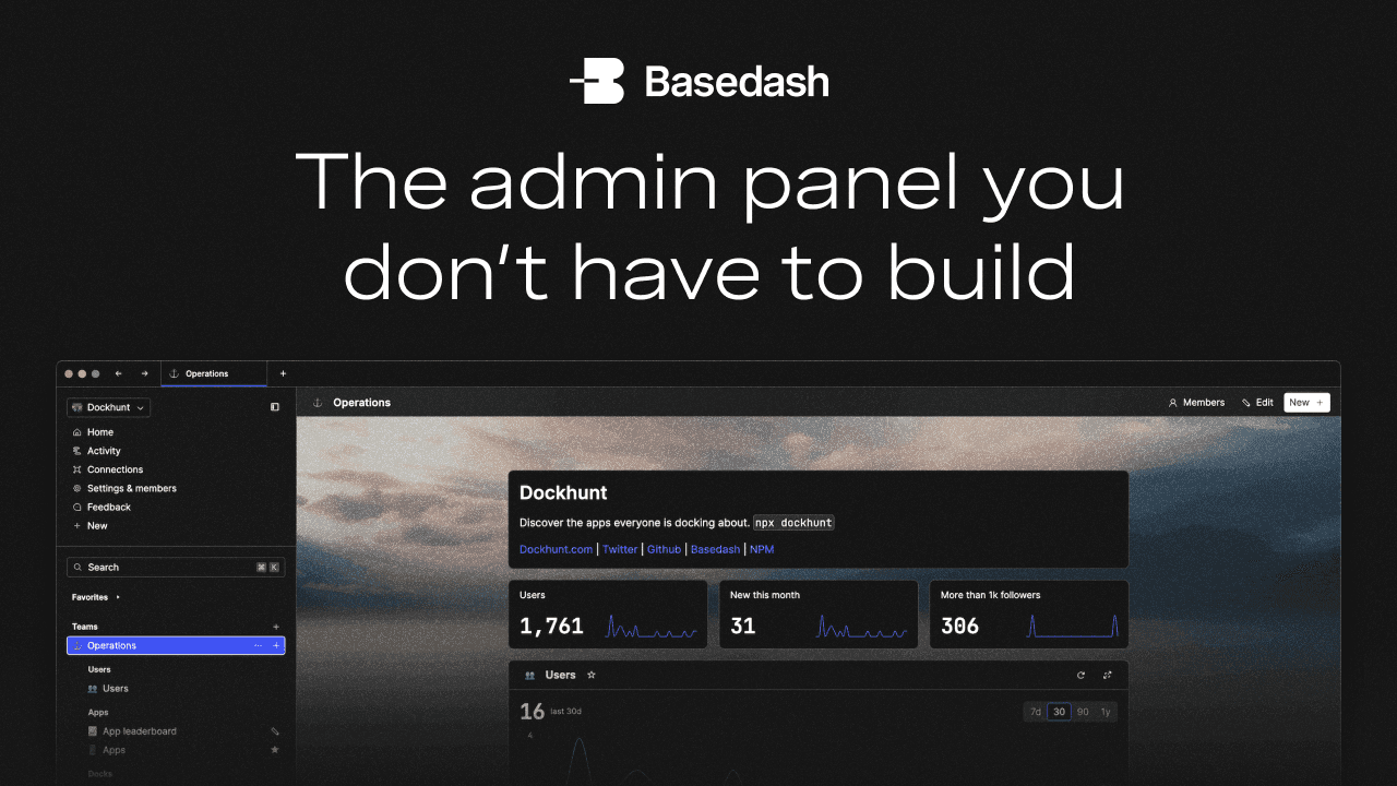 Basedash | The admin panel you don't have to build About Features Pricing Changelog Blog Docs Log in Sign up Log in Sign up About Features Pricing Log in Sign up Connect your database. Get an admin panel. Connect your database. Get an admin panel. An AI-generated interface to visualize, edit, and explore your data. An AI-generated interface to visualize, edit, and explore your data. Get started Book a demo This admin panel for Dockhunt was generated in 2 minutes from a Supabase database. Use cases Use cases Turn your database into a dataspace Turn your database into a dataspace Don't use database tools, out-of-date spreadsheets, or labor-intensive internal apps. Basedash is built for ops, eng, product, and support teams to work together and share insights so you help customers and grow your product without needing to build anything. Don't use database tools, out-of-date spreadsheets, or labor-intensive internal apps. Bas...