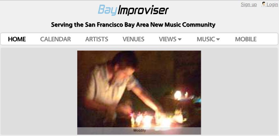 Bay Improviser Home Serving the San Francisco Bay Area New Music Community Sign up Login Home Calendar Artists Venues Views News Interviews Favorite Disks Music Albums Audio Samples Labels Videos Mobile Home Calendar Artists Venues Home Calendar Artists Venues View News Interviews Favorite Disks Music CDs Audio Samples Labels Videos Mobile About Us Upcoming shows 18 Dec Kuumbwa Jazz Center [320 Cedar St Santa Cruz, CA 95060]: [Victoria Victoria w/ Charlie Hunter and Scott Amendola ] More.. 19 Dec Make-Out Room [3225 22nd St SF]: [Jazz at the Make-Out: Life's Blood, Bafus/Raskin/Shiurba, Evangelista/Glenn/Maxson/Stahlmann] More.. 20 Dec North Fair Oaks Library [2510 Middlefield Road Redwood City, CA]: [Family Fun Day with visual artist Cristina Velázquez and Qu...