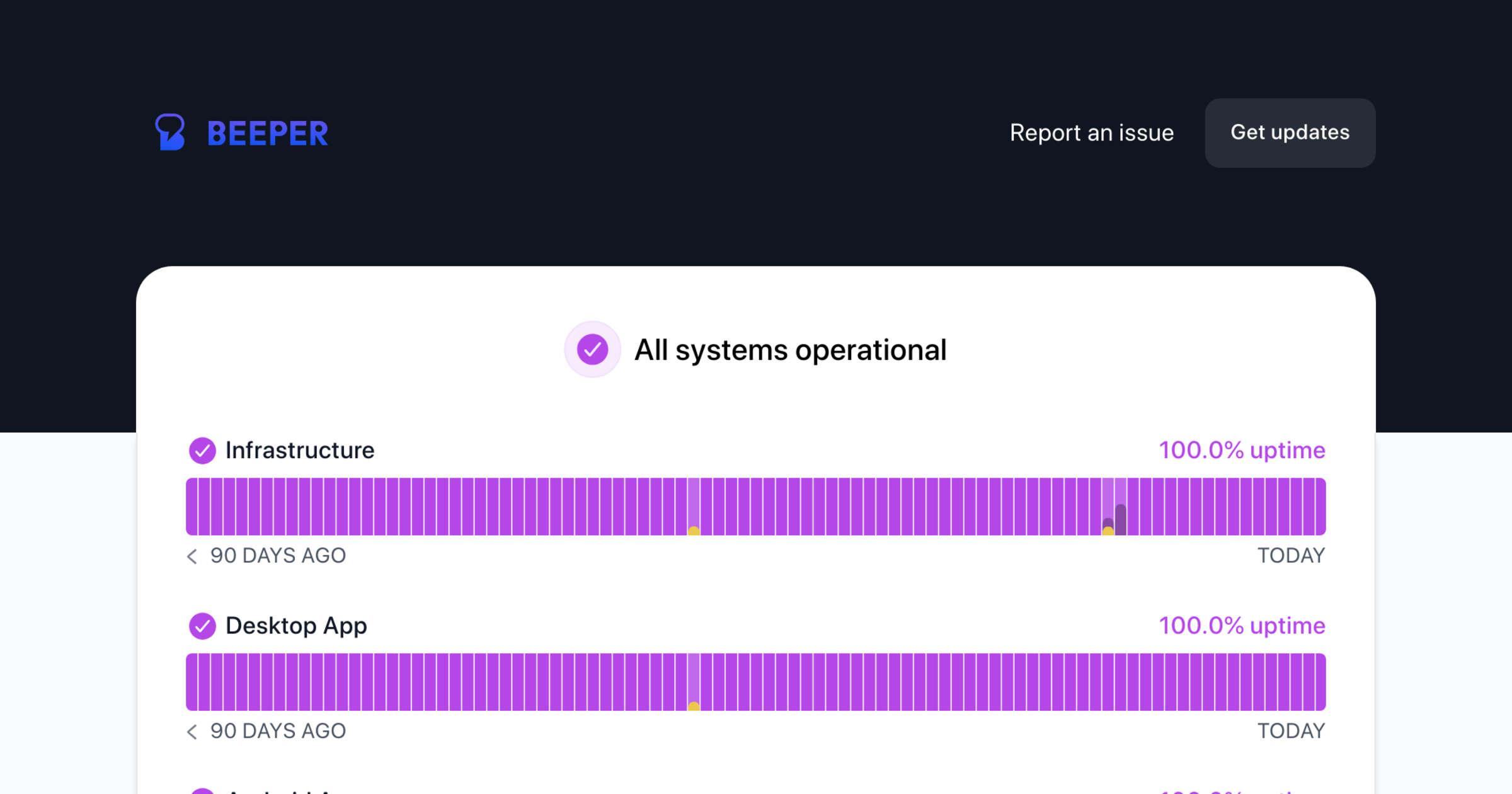 Beeper - Status Report an issue Get updates Email Slack Google Chat Webhook RSS Atom API Report an issue Get updates Dark mode All systems operational Infrastructure 99.92 % uptime 90 days ago Today Desktop App 99.92 % uptime 90 days ago Today Android App 99.92 % uptime 90 days ago Today iOS App 99.92 % uptime 90 days ago Today Connections 98.07 % uptime iMessage 95.61 % uptime 90 days ago Today WhatsApp 99.92 % uptime 90 days ago Today Instagram 99.83 % uptime 90 days ago Today Facebook 99.83 % uptime 90 days ago Today Google Messages (SMS/RCS) 99.92 % uptime 90 days ago Today Signal 99.92 % uptime 90 days ago Today Telegram 99.92 % uptime 90 days ago Today Beeper/Matrix 99.92 % uptime 90 days ago Today Discord 99.92 % uptime 90 days ago Today Slack 99.92 % uptime 90 days ago Today Google Chat 99.92 % uptime ...