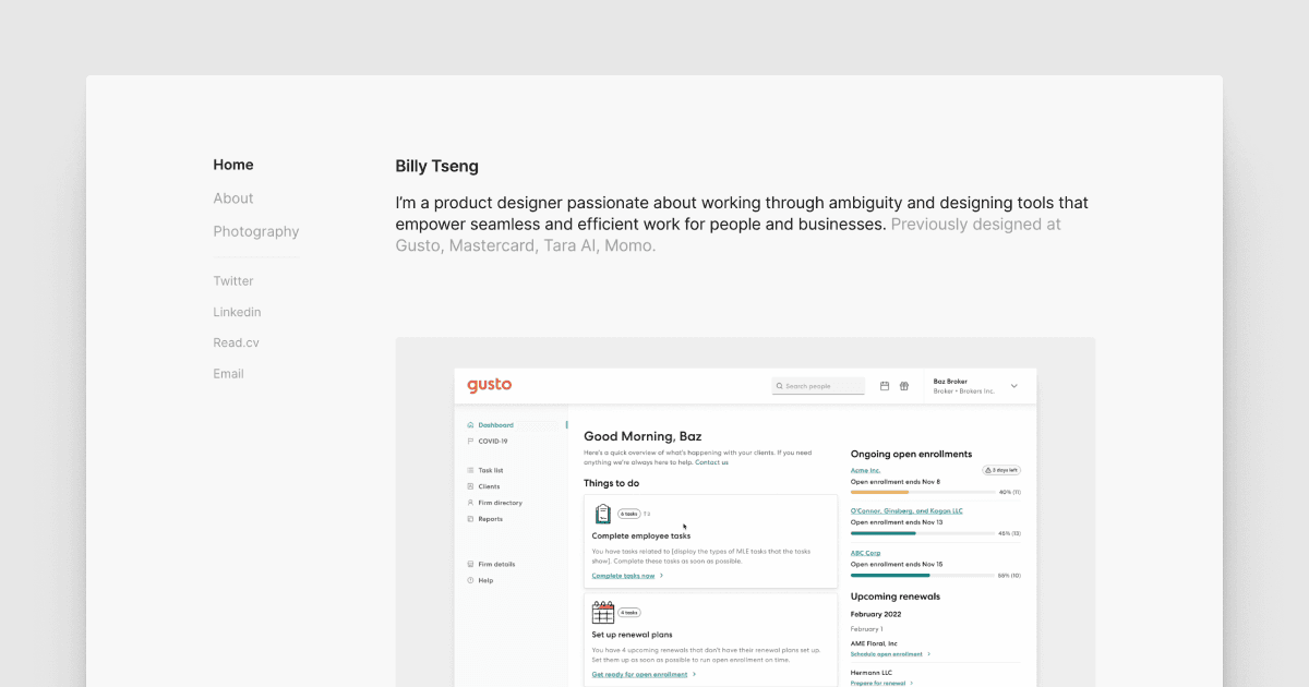 Billy Tseng — Product Designer Home About Photography Frontend Twitter Linkedin Read.cv Email Billy Tseng I’m a product designer passionate about working through ambiguity and designing tools that empower seamless and efficient work for people and businesses. Previously designed at Gusto, Mastercard, Tara AI, Momo. Home About Photography Frontend Home About Photography Frontend Billy Tseng I’m a product designer passionate about working through ambiguity and designing tools that empower seamless and efficient work for people and businesses. Previously designed at Gusto, Mastercard, Tara AI, Momo. Home About Photography Frontend Home About Photography Frontend Billy Tseng I’m a product designer passionate about working through ambiguity and designing tools that empower seamless and efficient work for people and businesses. Previously designed at Gusto, Mastercard, Tara AI, Momo. Home About Photography Frontend H...