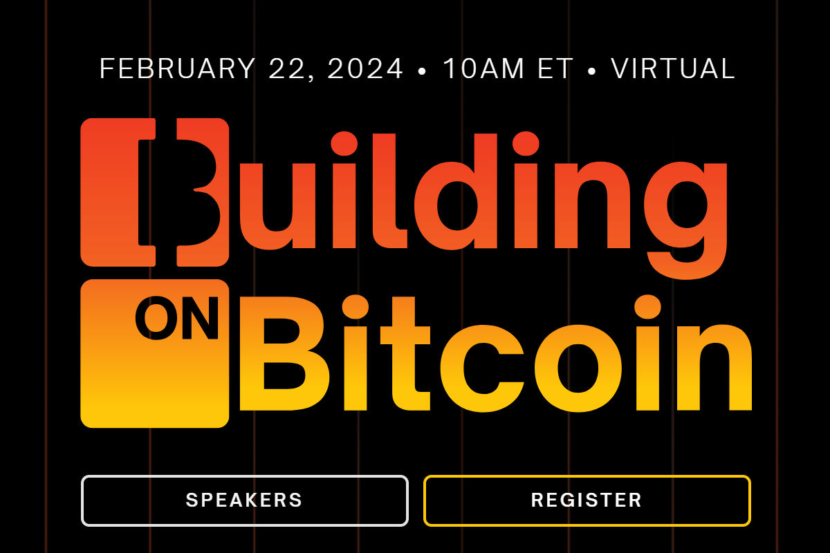 Building on Bitcoin | February 22, 2024 Register February 22, 2024 • 10AM ET • Virtual REGISTER SPEAKERS UNLEASH BITCOIN Developers are awakening to the possibilities of building on Bitcoin. The original blockchain is home to more than just boring old BTC; Layer 2s, DeFi apps, and more are making the Bitcoin economy click. Kickstarted in part by the rise of Ordinals and BRC-20s, bitcoiners of various stripes are now ensnared in a lively debate: What is Bitcoin for? Join the conversation at Building on Bitcoin. Ӿ SPEAKERS Speaker list updated weekly Muneeb Ali Founder of Stacks CEO of Trust Machines Laura Shin Crypto Journalist Founder and CEO, Unchained Jonathan Sadlowe General Partner Gossamer Capital Trevor Owens GP @btcfrontierfund CEO @ninjalerts Host of @TheOrdinalShow & Not Financial Advice @nftnow Dovey Wan Founder Primitive Ventures Alexei Zamyatin Co-founder, BOB Co-founder, Interlay Willem Schroe Founder Botanix La...
