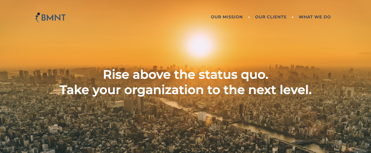 BMNT | Rise above the status quo Solution Areas • Careers • Our Clients • What we Do • Customer Success Rise above the status quo. Surprise yourself & your organization. BMNT is a global innovation company for governments & their partners. We transform how governments deliver new capabilities at speed and at scale. Join a global cadre of innovative organizations See Who Else > Personalized solutions for your needs and focus area Defense Health Space Homeland security Diplomacy Manufacturing Innovation-as-a-service entrepreneurial engagement workforce Development Academic Programs See how > The BMNT Promise View Services > prioritize what matters within 30 days There are many great ideas and capabilities around you, but only a limited number will be properly supported by your organization. You need to clear internal obstacles, access novel ideas and networks, and gain buy-in from key stakeholders to make your vision a reality. Lear...