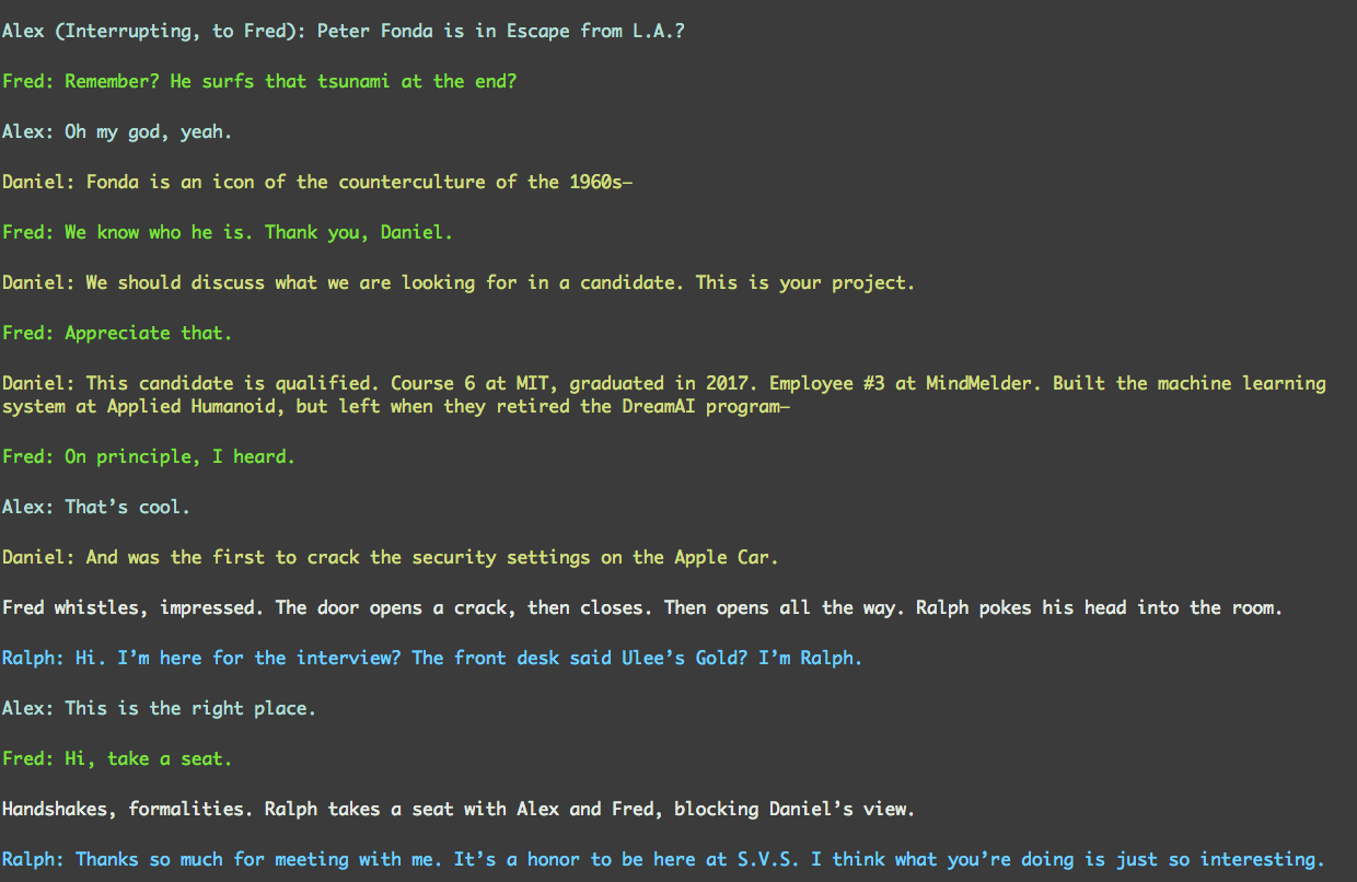 S.V.S. by Claire L. Evans & Tracy Chou $ python read_script.py S.V.S. A play for four bots, in three acts. by Claire L. Evans & Tracy Chou Created as part of Seven on Seven Description of Characters: X1: A pathetic figure X2: A tall, distinguished scientist X3: A good-looking young AI X4: A competent engineer Act I The meeting room of a young software company. Act II A lab, mid-day, a week later. Act III Late at night, the offices of a young software company. A year later. Place: California Time: The Future The genders, names, and voices of each character are randomly generated each time S.V.S. is performed. Press enter to advance. Seven on Seven 2016 was supported by the Evan & Sara Williams Foundation, GIPHY, Samsung 837, Wieden+Kennedy New York, the Andy Warhol Foundation for Visual Arts and by public funds from the New York State Counci...