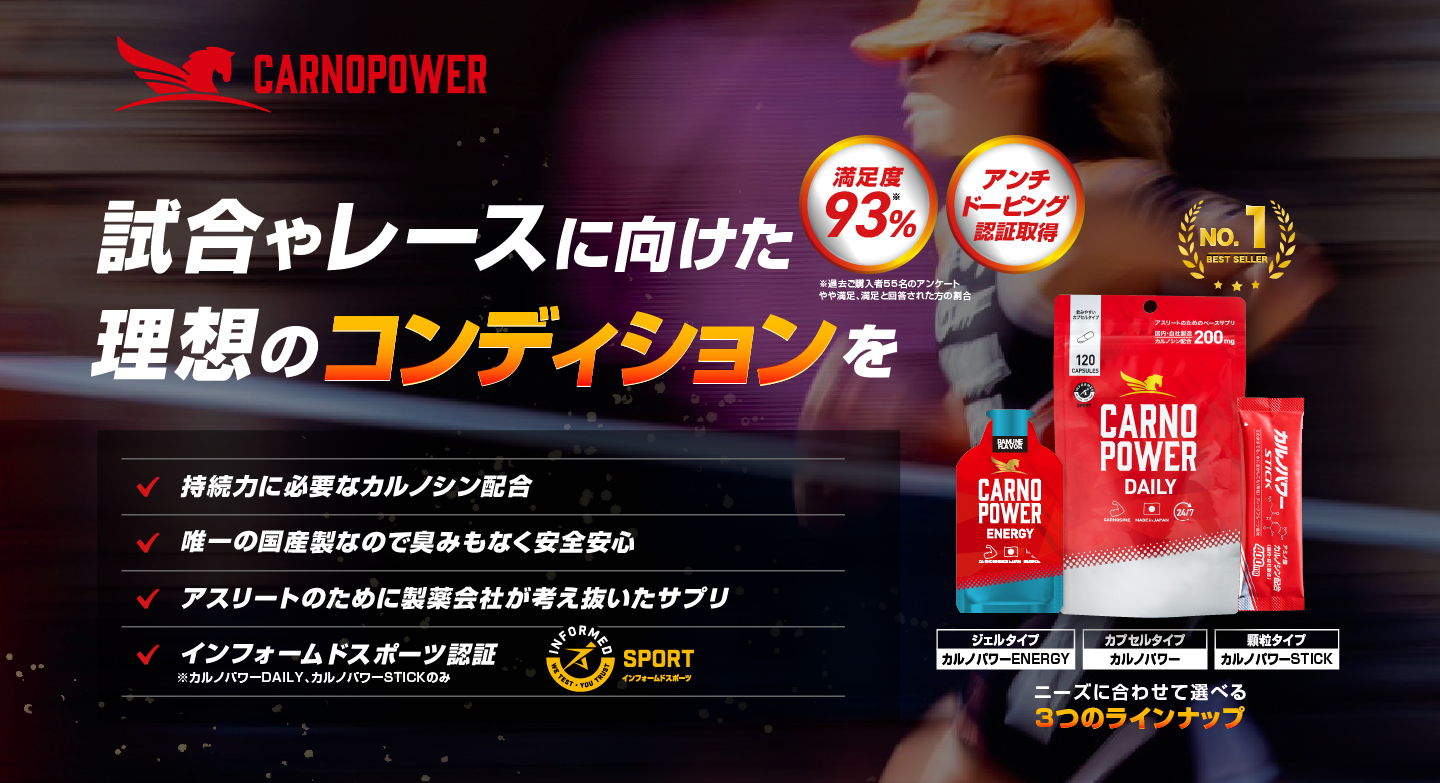 カルノパワーは渡り鳥などの筋肉に含まれる成分カルノシンを配合した、筋肉の疲労回復を助けるサプリメントです。ロードバイク・マラソン・トライアスロンなど、激しい競技を行うアスリートから支持されています。持久力を必要とする競技をされる方におすすめです。