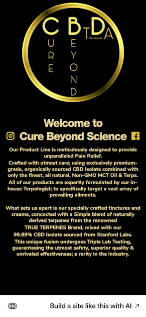 Cure Beyond Science Welcome to Cure Beyond Science Our Product Line is meticulously designed to provide unparalleled Pain Relief. Crafted with utmost care; using exclusively premium-grade, organically sourced CBD Isolate combined with only the finest, all natural, Non-GMO MCT Oil & Terps. All of our products are expertly formulated by our in-house Terpologist; to specifically target a vast array of prevailing ailments. What sets us apart is our specially crafted tinctures and creams, concocted with a Simple blend of naturally derived terpenes from the renowned TRUE TERPENES Brand, mixed with our 99.89% CBD Isolate sourced from Stanford Labs. This unique fusion undergoes Triple Lab Testing, guaranteeing the utmost safety, superior quality & unrivaled effectiveness; a rarity in the industry. Product Line Tinctures ADD TO CART Body Cream ADD TO CART Nano Emulsified Gummies ADD TO CART