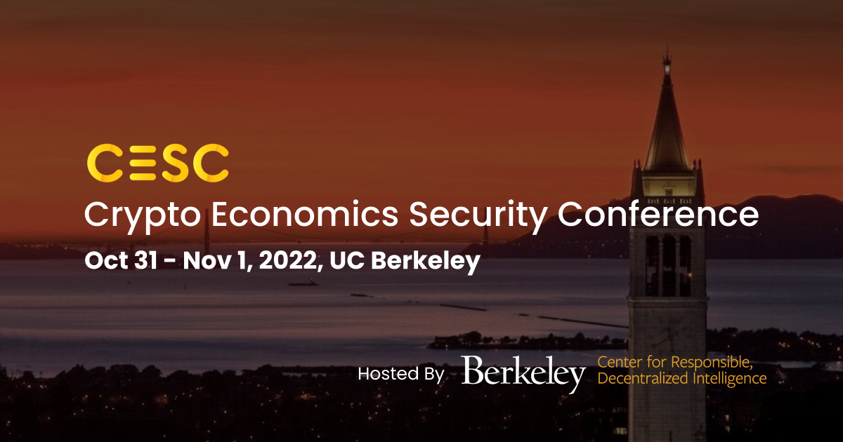 Center for Responsible, Decentralized Intelligence at Berkeley Crypto Economics Security Conference Oct 31 - Nov 1, 2022, UC Berkeley Hosted by The Crypto Economics Security Conference (CESC) aims to bring together researchers and practitioners to showcase and discuss the most recent developments in blockchain and Web3. CESC is hosted by Berkeley RDI , a multi-disciplinary campus-wide center, focusing on advancing the science, technology and education of web3, decentralization and empowering of a responsible digital economy. Conference Dates: Oct 31 - Nov 1, 2022 Venue: Pauley Ballroom, Martin Luther King Jr. Building, UC Berkeley Accommodations: Hotel Recommendations Virtual Attending: Registration (select attend virtually on order form) Join RDI Telegram for CESC announcements Register to attend in person or online Schedule of Events Oct 30 ZKP Workshop Oct 31 Career Fair Nov 1 Xcelerator Demo ...