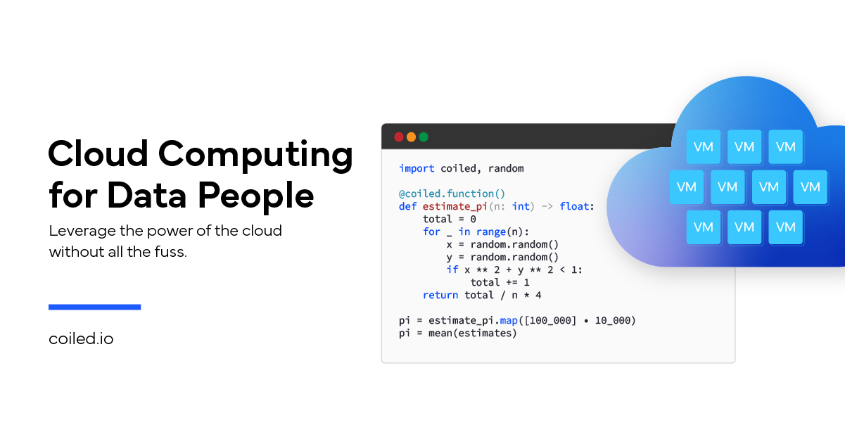 Home Pricing Simple Pricing Build vs. Buy Security Use Cases Docs Blog GET STARTED Login Cloud Computing for Data People It's time to ditch your VPN Leverage the power of the cloud without the fuss. Get Started Serverless Functions Dask Clusters CLI Jobs Jupyter Notebooks Scale functions on cloud Run custom functions in the cloud. Leave the provisioning, software, and creds to Coiled. Specify any hardware you want. It arrives in about a minute. Learn More Parallelism GPUs import coiled, random @coiled.function() def estimate_pi ( n: int ) -> float : total = 0 for _ in range (n): x = random.random() y = random.random() if x ** 2 + y ** 2 < 1 : total += 1 return total / n * 4 # runs remotely pi = estimate_pi( 1_000_000 ) import coiled, random @coiled.function() def estimate_pi ( n: int ) -> float : total = 0 for _ in range (n): x = random.random() ...
