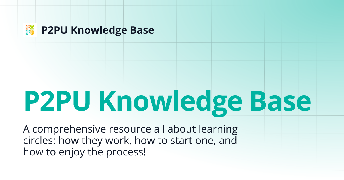 P2PU Knowledge Base | P2PU Knowledge Base P2PU Knowledge Base More Search Ctrl + K P2PU Knowledge Base A comprehensive resource all about learning circles: how they work, how to start one, and how to enjoy the process! Learning circles are free, lightly-facilitated study groups that meet regularly to learn from open educational resources. Rooted in values of community, peer learning, equity, and open access, a learning circle typically has the following components: a facilitator (responsible for organizing the learning circle, not teaching: the group should work together to understand the material; see Facilitating Peer Learning ) a group of learners (ideally 4–12 for an engaging group dynamic; see Finding Participants ) a regular meeting space (in-person or online; see Setting Up Meeting Spaces ) recurring meetings (90 minutes/week for 6–8 weeks is a sweet spot for building a productive group culture without being alienating due to the time commit...