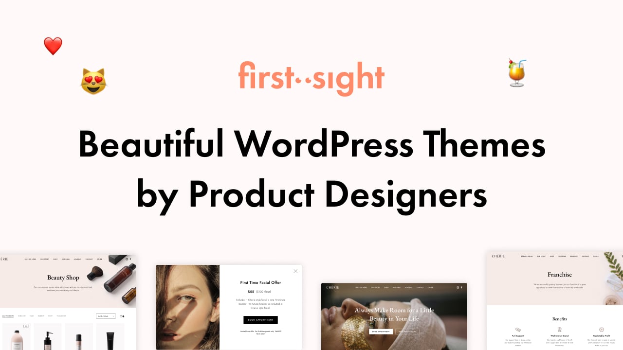 home – FirstSight Themes Our Story Philosophy Super Powers Support VIEW OUR THEMES CONTACT SUPPORT Latest Themes 👀 Meet our new themes, carefully designed for awesome projects Palette Photography Portfolio Multipurpose WordPress Theme Cherie Beauty Salon WordPress Theme Stay tuned We are working on a new theme. View All Nice to See You We are designers with 7 years of experience, who worked at top Silicon Valley companies, designed a lot of digital solutions and know how much resources you need to invest into a good website and product. Our Philosophy To make great-quality websites more affordable for businesses and give you opportunity to present yourself in the best way possible right from the start. We want you to be proud of your new website. first••sight team Our Super Powers We are here to apply design thinking approach and introduce a new level of quality for website solutions. We definitely know some secrets of how to boost the ...