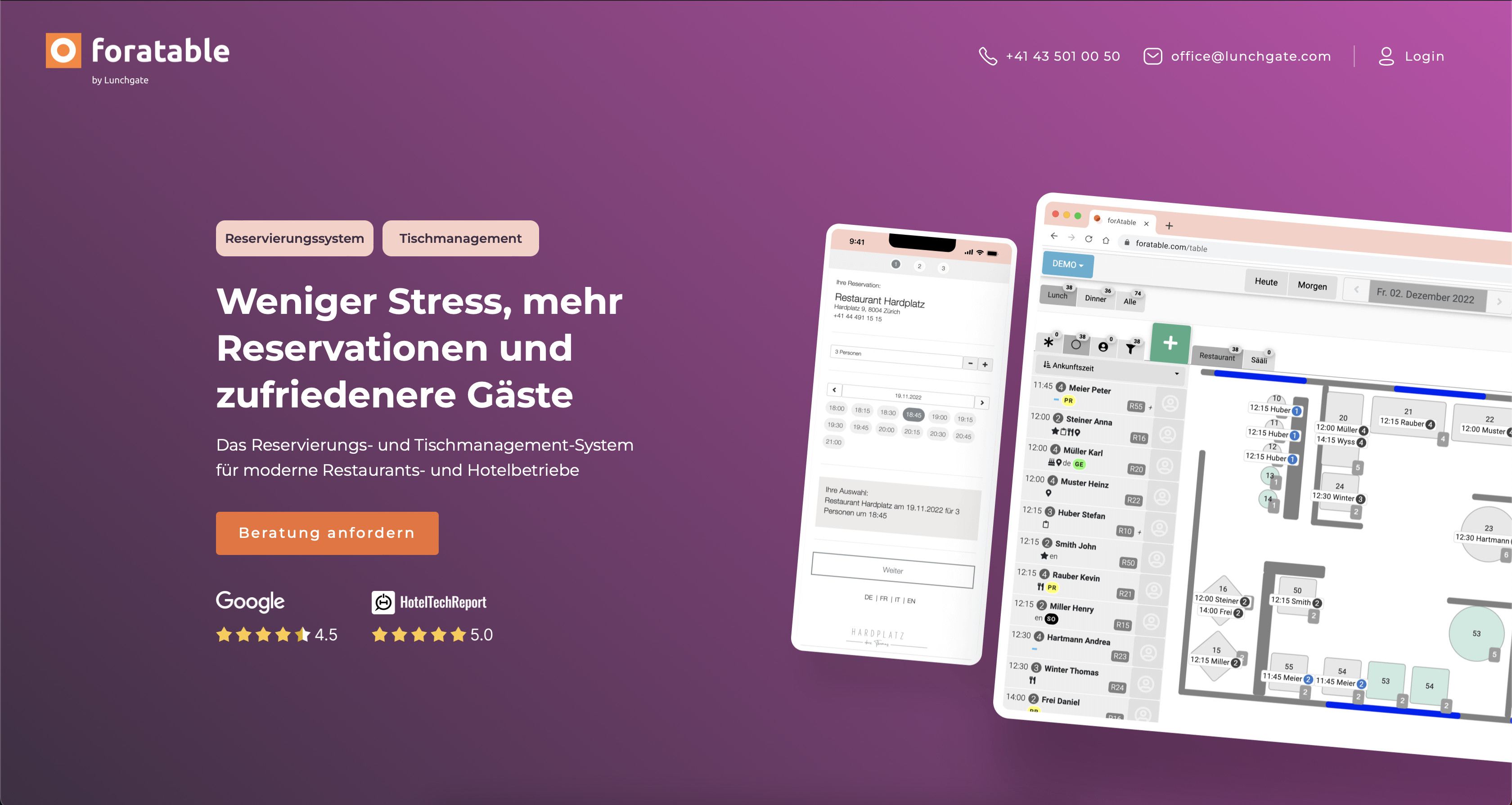 Hebe dein Gästeerlebnis auf ein neues Level. foratable ist das perfekte Restaurant Reservierungssystem. Zuverlässig, schnell und mit persönlichem Support.