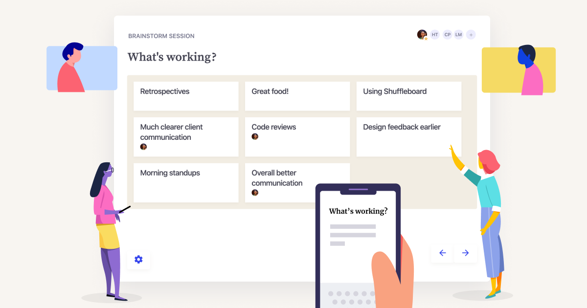 Shuffleboard | Capture live input in remote meetings Shuffleboard Pricing Log in Try for free Remote brainstorming made simple Capture ideas, collect votes, and get your team aligned around the next big thing Try your first session free Free trial · No credit card required You type a question People answer on their own device Timers, voting, and more Reorder and stack ideas Strategy workshop What's working well? Great communication between teams Started meetings on time and ended early Got customer feedback early and reacted fast Great planning workshop on Tuesday! Broke big tasks down into small chunks (instead of doing everything at once) More time spend with support staff Clear goals from the beginning We hit our deadline! thumb_up_off_alt sort timer arrow_back arrow_forward Just like sticky notes—without the hassle Here's how it works Organize your session with slides Each slide has an open-ended question that everyone can an...