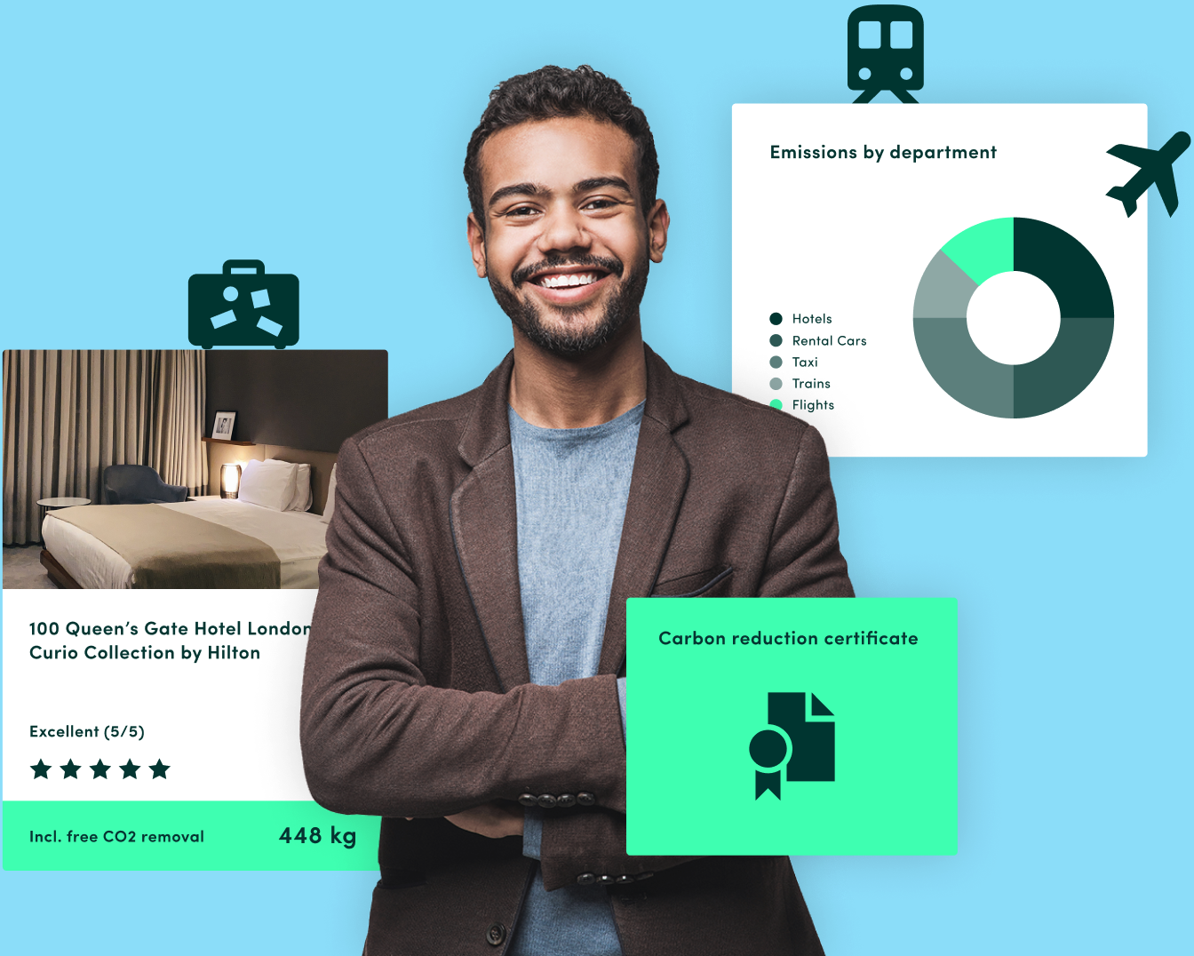 Choose responsible travel options, track emissions, and offset them for free with Goodwings. Our sustainability-focused travel management system helps you travel responsibly while reducing your carbon