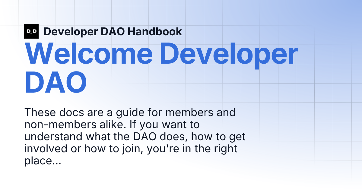 Welcome Developer DAO | Developer DAO Handbook Developer DAO Handbook More Ask or Search Ctrl + K 👋 Welcome Developer DAO These docs are a guide for members and non-members alike. If you want to understand what the DAO does, how to get involved or how to join, you're in the right place. What is Developer DAO? We are a developer-owned and governed community learning and building for Web3. What do we do? We provide opportunities and incentives for builders of all levels to learn about Web3 and build projects that impact the world. What is this handbook? Your guide to everything Developer DAO. Communities, and DAOs in particular, can be confusing and overwhelming, so we aim for this handbook to make it easy to understand and find your way in the DAO. First Steps... Now you know a little bit about us, you're ready to take your First Steps ... Next First Steps Last updated 1 year ago