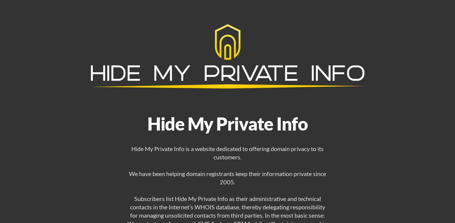 Hide My Private Info (HMPI) Hide My Private Info Hide My Private Info is a website dedicated to offering domain privacy to its customers. We have been helping domain registrants keep their information private since 2005. Subscribers list Hide My Private Info as their administrative and technical contacts in the Internet’s WHOIS database, thereby delegating responsibility for managing unsolicited contacts from third parties. In the most basic sense: We protect you from email, SMS & phone SPAM while still retaining ownership of your domain. If you are having issues with a domain (eg.: Copyright Infringement, SPAM, etc.). Please see the instructions on how to contact this domain at the bottom of this page. Frequently Asked Questions (FAQ) How do I sign up to use your service? Send us a BLANK e-mail to apply@hidemyprivateinfo.com . Once you do this, you will receive instructions on how to proceed. Our service costs you nothing. We believe in keeping data private. Thus most of ...