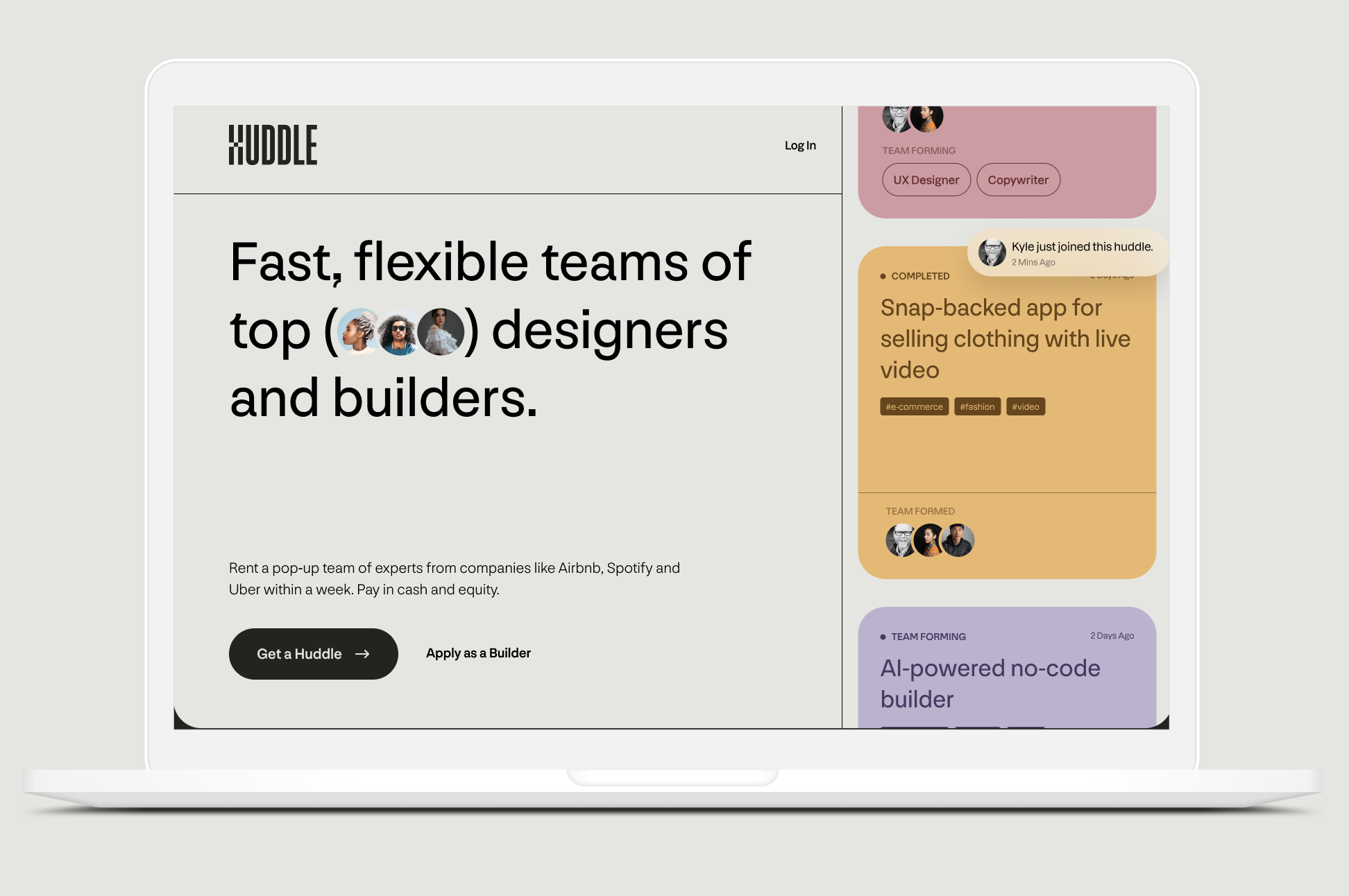 Huddle Announcing Huddle's $3.4M seed by Wave Capital, IDEO and Outlander Showcase ✦ Sign in → Get a pop-up team of superstar ( ) designers and builders Fast, flexible teams of top ( Spotify design manager PM @ Airbnb Founding Engineer ) designers and builders. Fast, flexible teams of top ( Spotify design manager PM @ Airbnb Founding Engineer ) designers and builders. Get a pop-up team of experts from companies like Airbnb, Spotify and Uber within a week. Pay in cash and equity. Get a Huddle → Apply as a Builder • ACTIVE 2 days ago AI veteran applying robotics to a new industry #robotics #ai #minorityfounder • ONGOING 2 days ago OneMedical for psychedelic and naturopathic therapists #psychedelics #healthcare #mentalhealth BUILDING... MVP App iOS Development • ACTIVE 2 days ago Sports analytics platform powering more wins #data #b2b #fitness • SHIPPED 🚀 2 days ago AI-powered chat ...