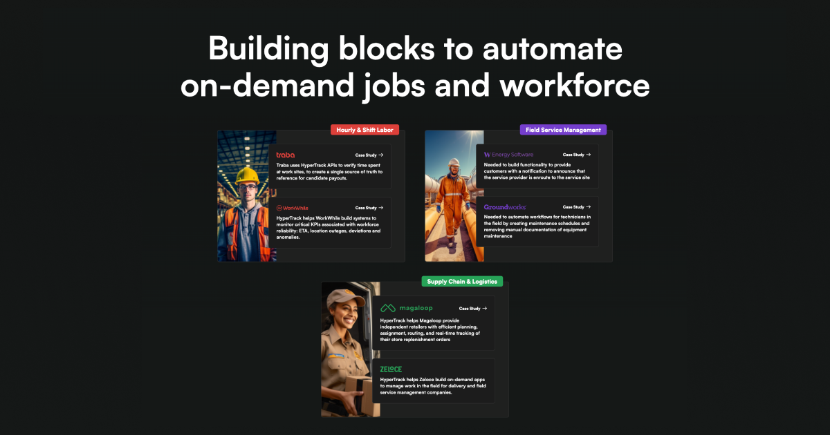 Building blocks to automate on-demand jobs and workforce Product Plan and Assign Self-improving Routes Nearby Search Track and Validate Flex Routes On-time Routes Geofences Geotags Use case Live Order Tracking for Customers Dispatch Orders to Nearby Drivers Order Assignment and Route Optimization Productivity of Visits and Routes Pay Fairly Based on Ground Truth Enable Visibility to Ops Teams Solution Hourly & Shift labor Field service management Supply chain & logistics Case studies Hourly & Shift labor Traba case study Gigable case study Supply chain & Logistics Magaloop case study Zeloce case study Field service management W energy case study Groundworks case study Reach case study Pricing Docs Blog Partners Press LOGIN HyperTrack Demo Day Join us at Gig Work Summit on Oct 5, 2023 to build next generation tech for gig work and on-demand delivery! Register Now → Building Blocks to Automate On-demand Jo...