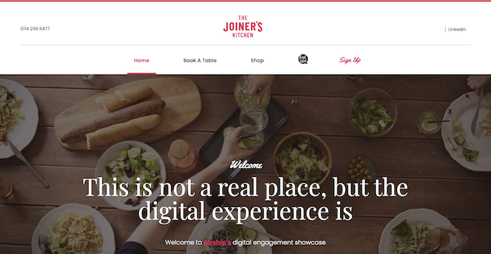 Joiners Kitchen - Sign Up to our Demo by Airship Home Book a table Shop Sign Up Call Luci for a Demo on +44 7958 434 641 Follow Airship on LinkedIn | Twitter | Instagram Home Book a Table Shop Sign Up Close Win £50 Gift Card to your favourite hospitality brand! Joiner's kitchen is Airship and Toggle's in-house restaurant brand; used to demonstrate our platforms. When you sign up to Joiner's kitchen, you're enrolled in monthly draw, where you'll get a chance to win £50 gift card to a Toggler of your choosing! Sign up & Win Welcome This is not a real place, but the digital experience is Welcome to Airship's digital engagement showcase This is how we do digital engagement for the hospitality industry This is The Joiner's Kitchen Airship fictional restaurant with a very real digital experience . Sign up to The Joiner's Kitchen to see some of the basic, but powerful automated journeys that your customers could be taken through. Sti...