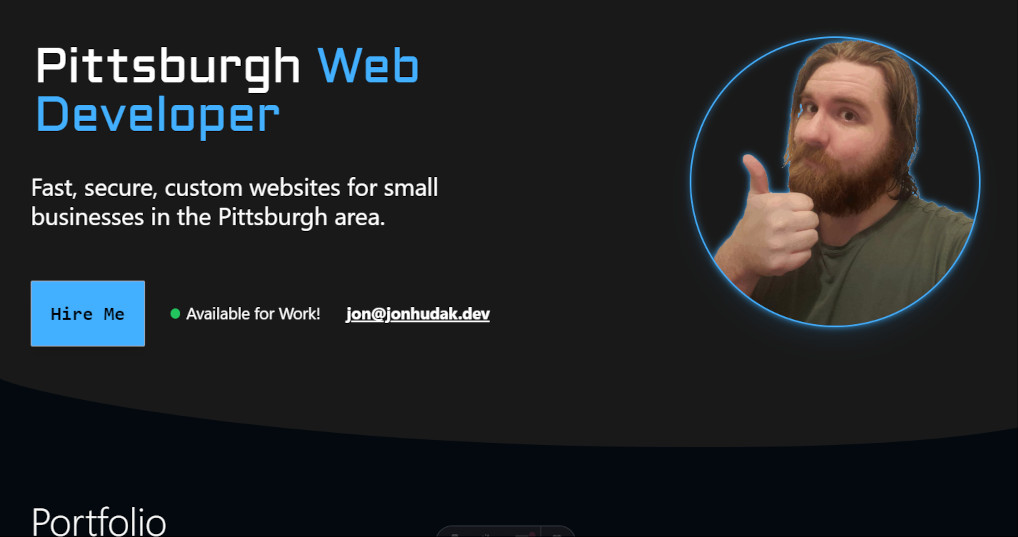 #1 Pittsburgh Web Developer | Jon Hudak #1 Pittsburgh Web Developer | Jon Hudak Menu Home About Blog Contact This animation doesn't work on your browser. Let me know so I can fix it! Pittsburgh Web Developer Fast, secure, custom websites for small businesses in the Pittsburgh area. Hire Me Available for Work! jon@jonhudak.dev Portfolio https://www.therealityroom.com/ This image isn't working on your browser. Let me know so I can fix it! Reality Room Go to Site https://www.pennbrew.com/ This image isn't working on your browser. Let me know so I can fix it! Penn Brewery Go to Site https://www.fullmoonchaos.com/ This image isn't working on your browser. Let me know so I can fix it! Full Moon Chaos Go to Site Why Work With Me? Performance When a website takes even 3 seconds to load, it could result in as many as 32% more people leaving before it even fully loads...