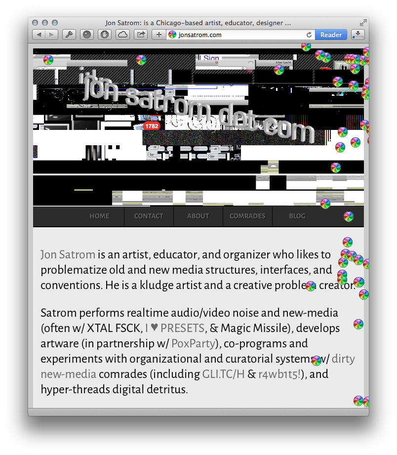 Jon Satrom: is a Chicago-based artist, educator, designer ... Home Contact About Blog Menu Jon Satrom is an artist , educator , and organizer who problematizes old and new media structures, interfaces, and conventions. He is a kludge artist and a creative problem creator. By day, he fixes things, interviews folks, and creates digital tools at studiothread . By night, he breaks things in search of the unique blips inherent to the systems we use. Satrom performs realtime audio/video noise and new-media (often w/ XTAL FSCK , I ♥ PRESETS , & Magic Missile), develops artware (in partnership w/ PoxParty ), and has co-programed and experimented with organizational and curatorial systems w/ dirty new-media && glitch comrades (including GLI.TC/H && r4wb1t5! .) He has performed, workshopp...