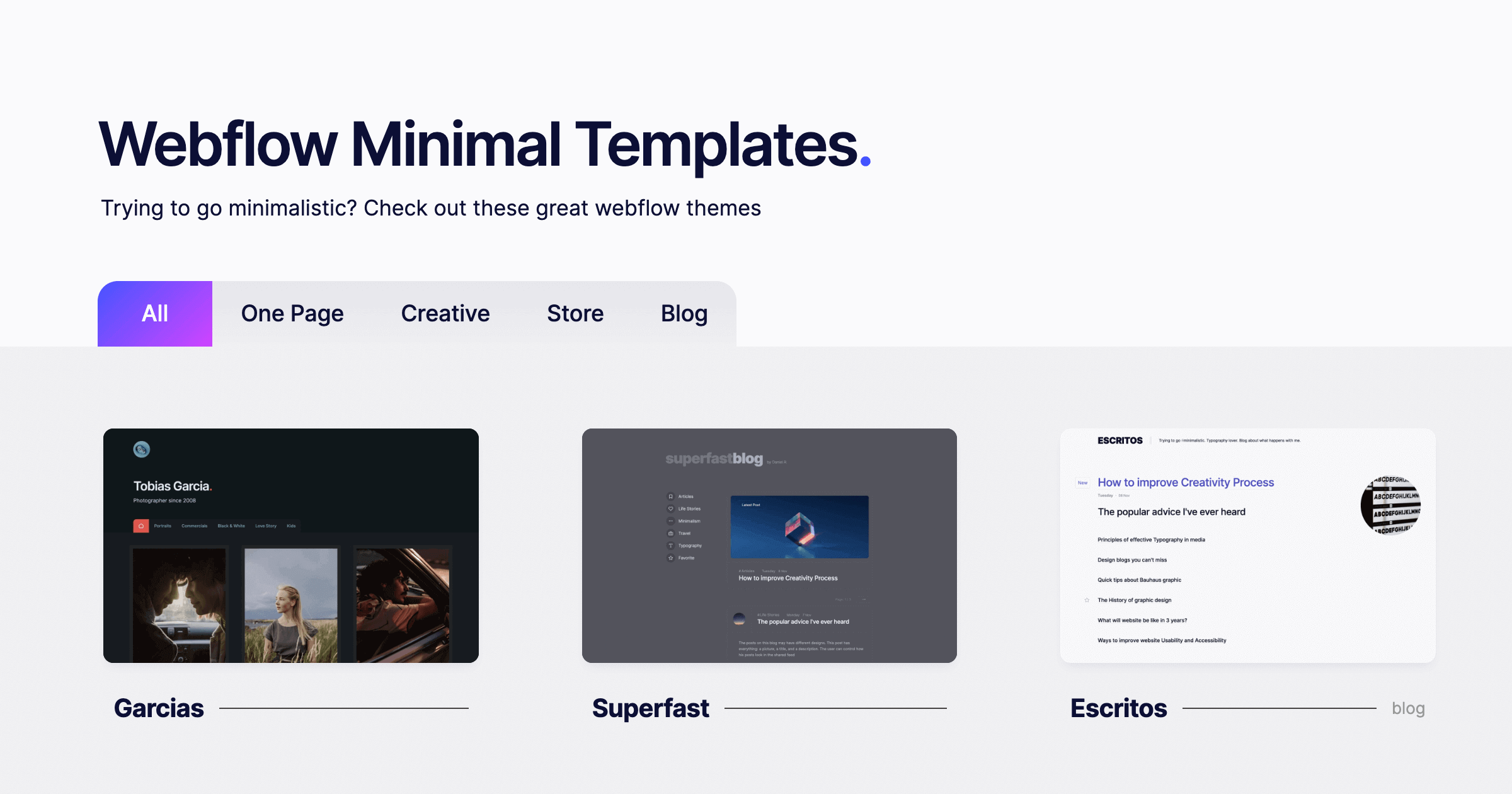Webflow Templates and Themes for those who appreciate Minimalistic style. One page webflow templates, creative themes, stores. Minimal blog templates for webflow