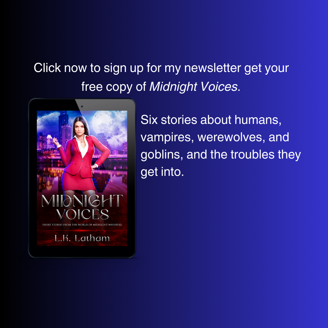 L.K. Latham is the author of the Midnight Whispers series, stories about humans, vampires, werewolves, goblins, witches, and other creatures striving to live in harmony. If you enjoy stories with stro