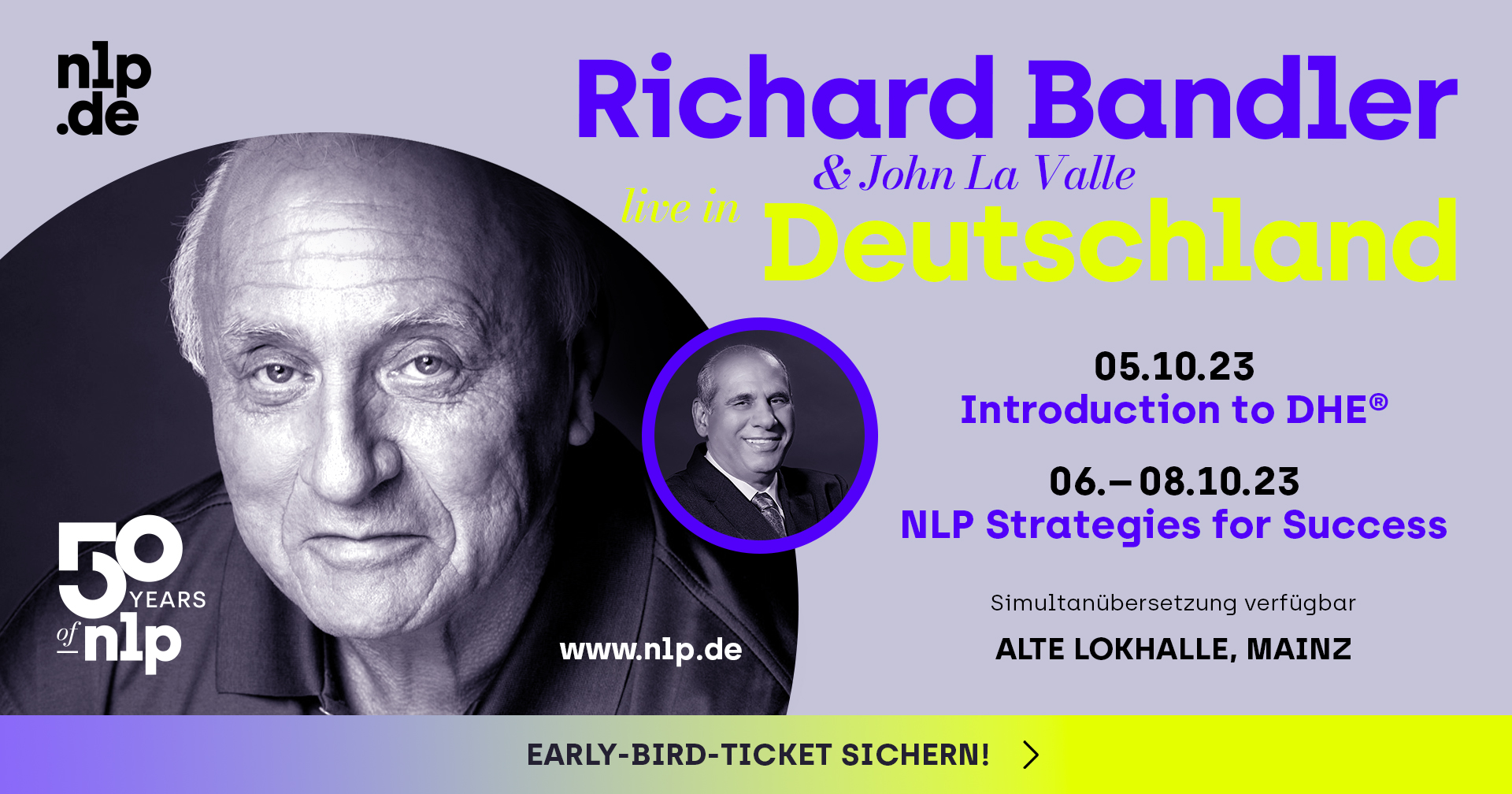 Erlebe Richard Bandler, den Mitbegründer und das kreative Genie hinter NLP, live im Oktober 2023 in Mainz. Sichere Dir jetzt Dein Ticket zum Early-Bird-Preis!
