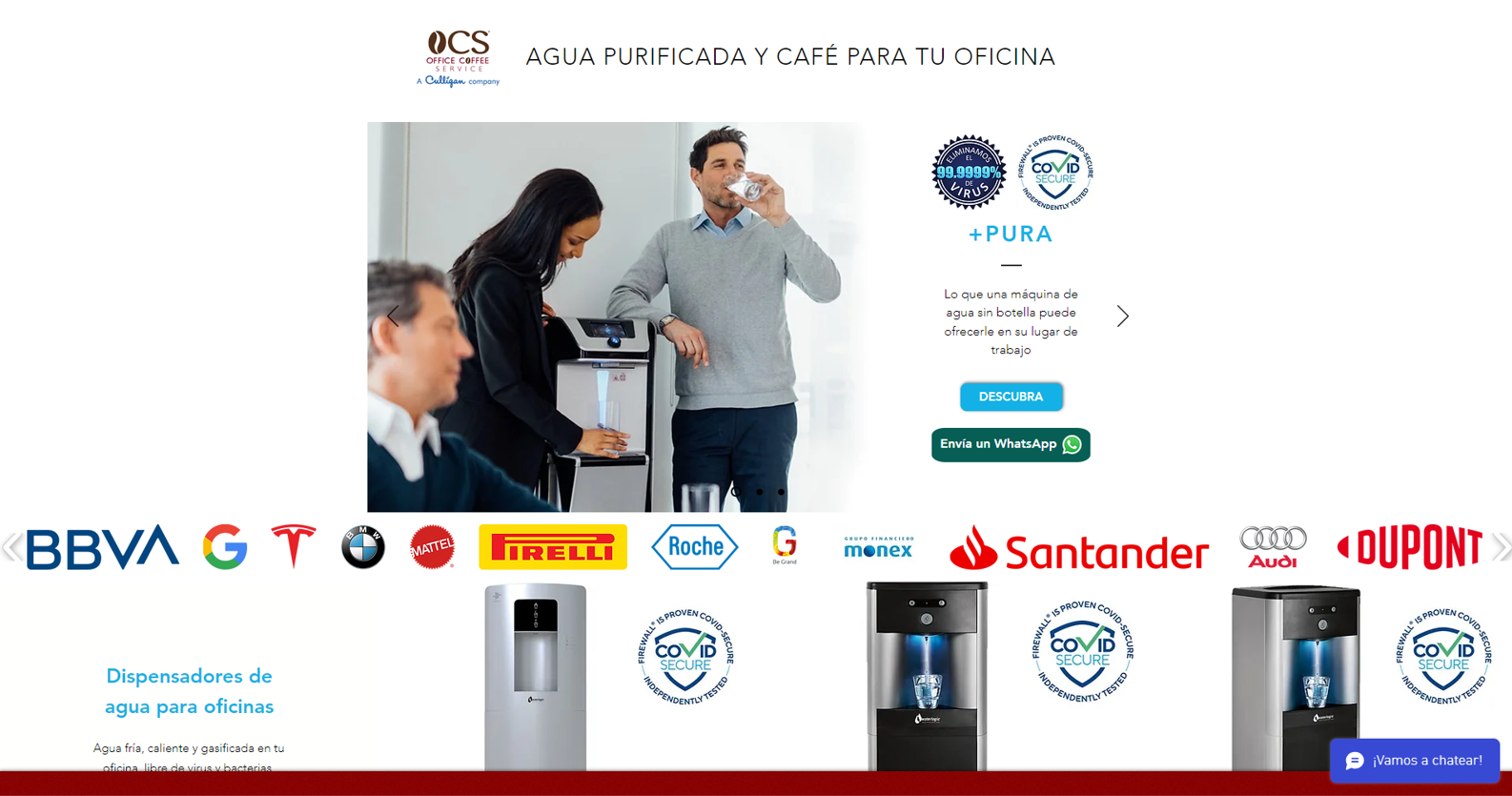 Office Coffee Service A Culligan Company I Servicio de agua y café I Máquinas +Pura, Nespresso, Nescafé top of page AGUA PURIFICADA Y CAFÉ PARA TU OFICINA +PURA Lo que una máquina de agua sin botella puede ofrecerle en su lugar de trabajo DESCUBRA Envía un WhatsApp To play, press and hold the enter key. To stop, release the enter key. Dispensadores de agua para oficinas Agua fría, caliente y gasificada en tu oficina, libre de virus y bacterias. Más información Máquinas de café Nespresso Professional Una gama especializada de máquinas de café profesionales para oficinas, diseñadas para satisfacer las necesidades de tu empresa. Más información Máquinas de café Nescafé La mejor solución de café para tu oficina o centro de trabajo. Más información OFFICE COFFEE SERVICE Dedicados desde hace más de 20 años a brindar un servicio integral por medio de alianzas estratégicas con Empresas Líderes en sus respectivos sectores. Integramos servicios para oficina ju...