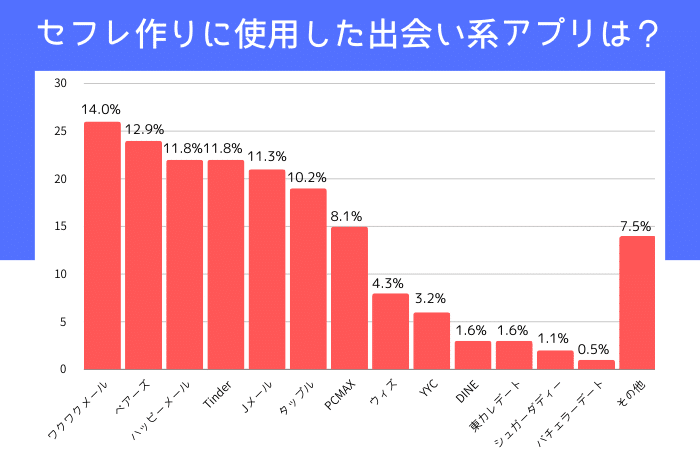 セフレ出会系アプリ・サイトおすすめランキング|人気のマッチング方法を紹介 MENU セフレ出会系アプリ・サイトおすすめランキング|人気のマッチング方法を紹介 出会い系アプリを使ったセフレの作り方に悩んでいませんか? マッチングはするのに返事が来ない ただの友達になってしまう エロい相手が見つからない 出会い系アプリでセフレができないのは、アプリ選びを間違っているからかもしれません。 まずはセフレを作ったおすすめ出会い系アプリを、ランキング形式で比較して紹介します。 本気でセフレを見つけたいなら、出会い系アプリ選びから重視しましょう! 目次 131人に聞いた!セフレを作れたアプリや期間をアンケート セフレ作りに利用した出会い系アプリNO.1は「ワクワクメール」 アプリを利用して遊び相手(セフレ)と出会えた期間は「1~2週間」が最多 アプリを利用してマッチ(相互いいね)した人数の最多は「5人以内」 アプリを利用して実際に出会った人数は「3人」が最多 セフレアプリ・サイトおすすめランキング12選 アプリを使ったセフレの作り方・探し方を解説 セフレアプリ1位:Jメール セフレアプリ2位:ワクワクメール セフレアプリ3位:ハッピーメール セフレアプリ4位:PCMAX セフレアプリ5位:YYC セフレアプリ6位:Tinder セフレアプリ7位:ペアーズ セフレアプリ8位:タップル セフレアプリ9位:DINE セフレアプリ10位:シュガーダディ セフレアプリ11位:カップリンク セフレアプリ12位:ウィズ 目的別|おすすめセフレアプリ【無料・即会い・熟女】 無料でセフレを作りたい人向け 即会いしたい人向け 熟女をセフレにしたい人向け 年代別|おすすめセフレアプリ【20代・30代】 20代におすすめのアプリ 30代におすすめのアプリ セフレを作りやすいマッチングアプリの選び方 アプリに登録しているセフレ女性の特徴 安全に出会えるセフレアプリの特徴 アプリでセフレが作れる人の特徴 アプリでセフレが作れない人の特徴 セフレアプリでのモテるプロフィールの作り方 セフレアプリで女性にモテるプロフ写真の撮り方 セフレア...