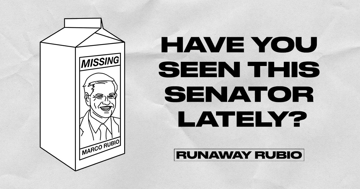 Runaway Rubio Skip to content Have you seen this senator lately? Floridians are trying to find their US Senator, Marco Rubio, and what exactly it is he’s been doing that actually helps Floridians since taking office more than a decade ago. February 21, 2018 is the last day Sen. Rubio held a public town hall meeting. On The Issues that Matter Most to Floridians Sen. Rubio doesn't seem to do much of anything...other than vote against Floridians' best interest. $1,400 Stimulus checks The American Rescue Plan, H.R. 1319 Raise Wages and Benefits The PRO Act, H.R. 842 Child Tax Credit Monthly Payments The American Rescue Plan, H.R. 1319 Build Infrastructure And Create Jobs INVEST in America Act, H.R. 3684 Cut Social Security and Medicare Sen. Rand Paul Budget Amendment, S.Amdt. 3150 to S.Con.Res. 14 Help Sen. Rubio Find His Way Home Take action and ensure Florida has real representation in Washington, D.C. Download Directions Download these directio...