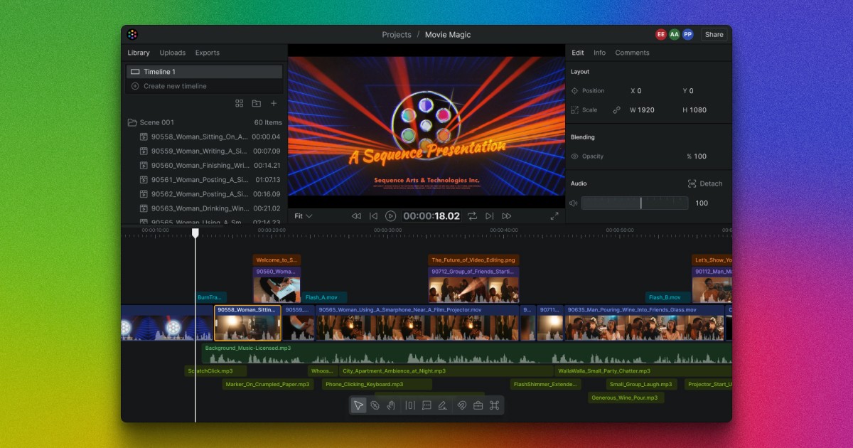 Sequence Video Editing. Rebooted. Video Editing. Rebooted. Video Editing. Rebooted. Browser accessible. Cloud rendered. More power for your project. No matter where you are, edit your video projects in the web browser. Cloud GPUs give you the power to render your assets and scale from a TikTok video to a feature film, while true multiplayer collaboration keeps everyone on the same page. Watch the Trailer Multiplayer Reflow Timeline Focus on your narrative instead of the timecode. A reflow timeline system handles conflicts through time and protects connections between assets, even in multiplayer. Multiplayer Reflow Timeline Focus on your narrative instead of the timecode. A reflow timeline system handles conflicts through time and protects connections between assets, even in multiplayer. Timeline Tools Choose from a variety of classic tools like selection, cutting, and layout controls, plus innovative features like placeholders and commenting. Tim...