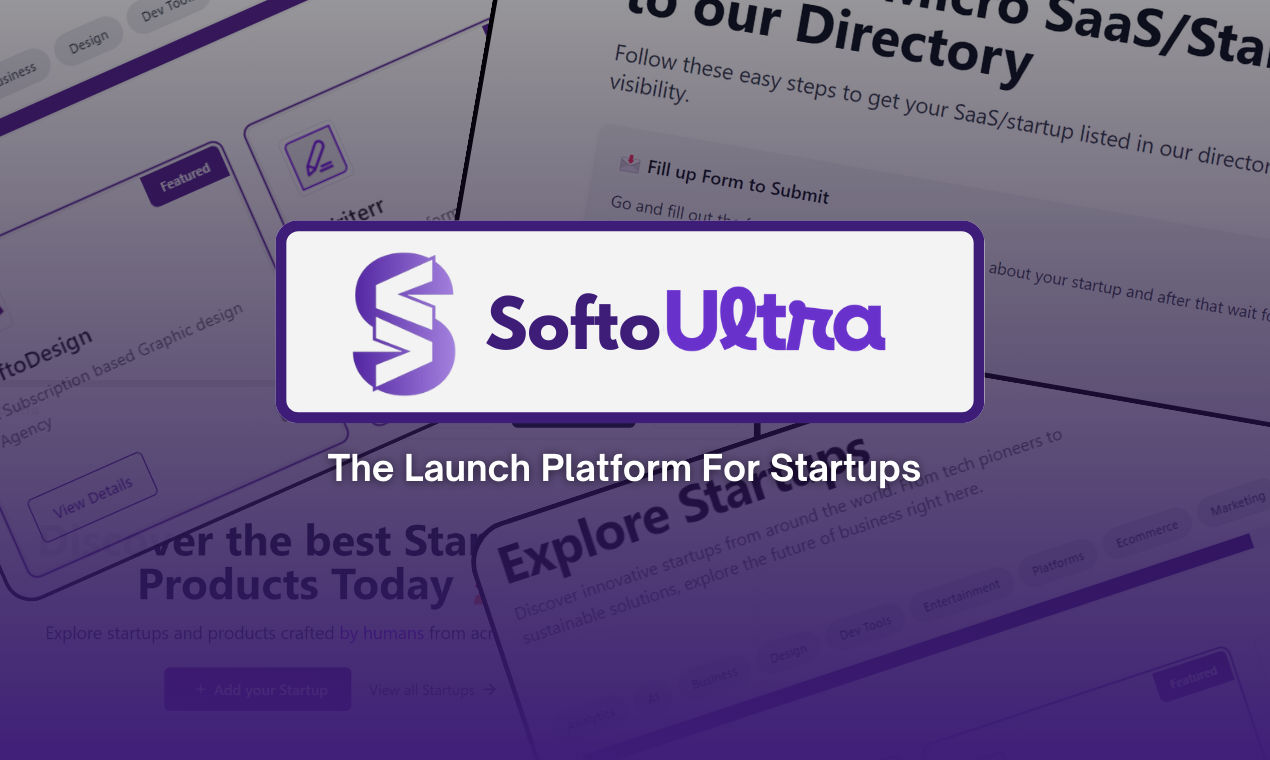 SoftoUltra - Discover Ultra Startups SoftoUltra Add Listing Community Startups Pricing Discover the best Startups & Products Today 🚀 Explore startups and products crafted by humans from across the internet. Add your Startup View all Startups Startup Directory Loading startups... SoftoUltra Add Listing Community Startups Pricing Frequently Asked Questions Here are some of the most frequently asked questions about Softoultra and how to get featured. Looking for something else? Chat with us via softoultra@trysoftodesign.com . What is Softoultra? Softoultra is the ultimate platform to discover exciting new startups and showcase your own — absolutely free! Gain visibility and connect with a broader audience by listing your startup. All types of startups and products are welcome. Your startup will receive its own unique page, just like this example: softoultra.com/softodesign . How do I get featured? To get featured on Softoultra, You need ...