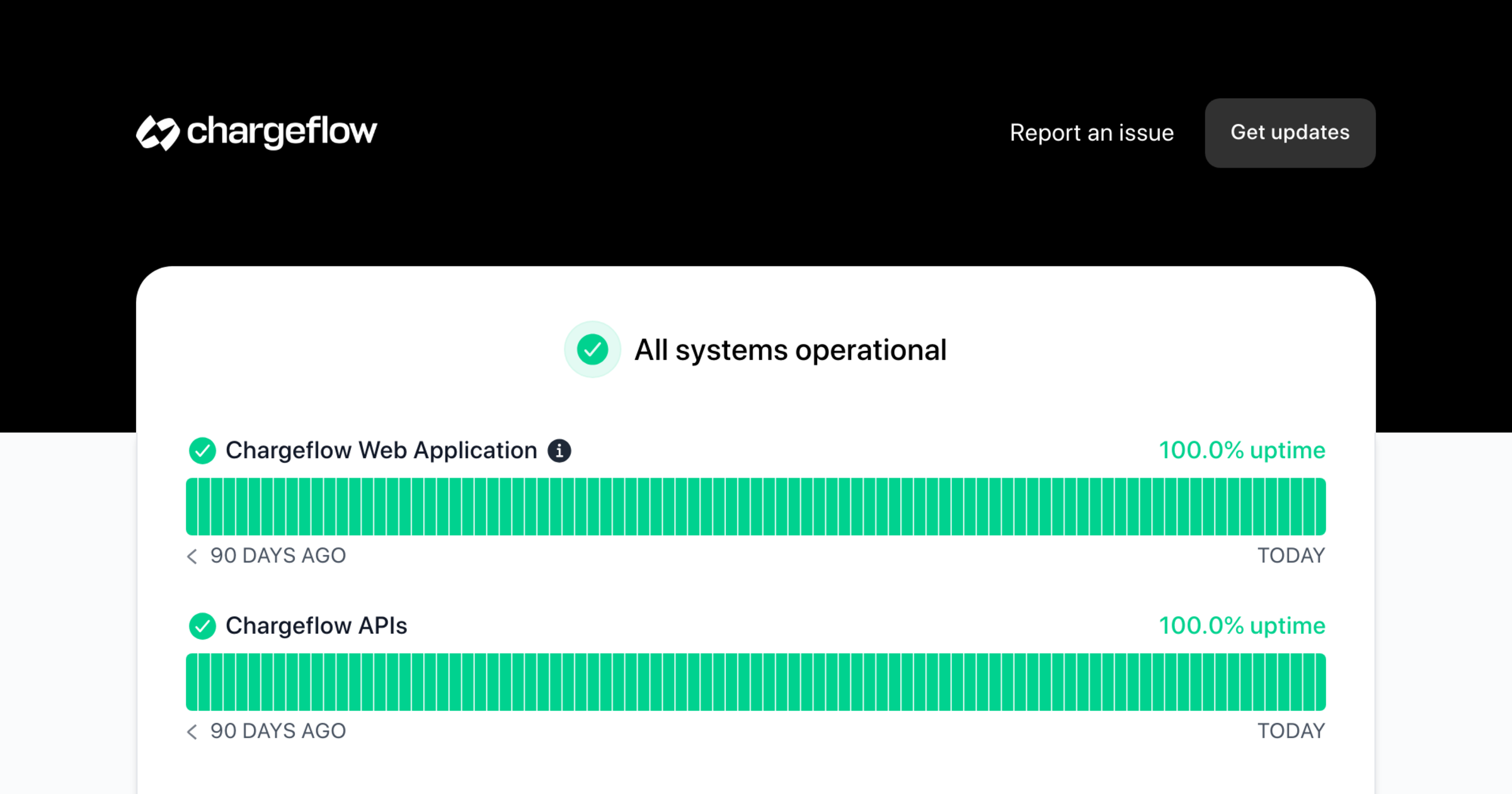 Chargeflow Status Page Chargeflow - Status Page Report an issue Get updates Email Slack Microsoft Teams Google Chat Webhook RSS Atom API Report an issue Get updates All systems operational Chargeflow Web Application - Operational Chargeflow Web Application 100% - uptime 100.0% uptime Read uptime graph for Chargeflow Web Application Full History 90 days ago Today Chargeflow APIs - Operational Chargeflow APIs 100% - uptime 100.0% uptime Read uptime graph for Chargeflow APIs Full History 90 days ago Today Recent notices No notices reported for the past 7 days Show notice history Show notice history Powered by Instatus