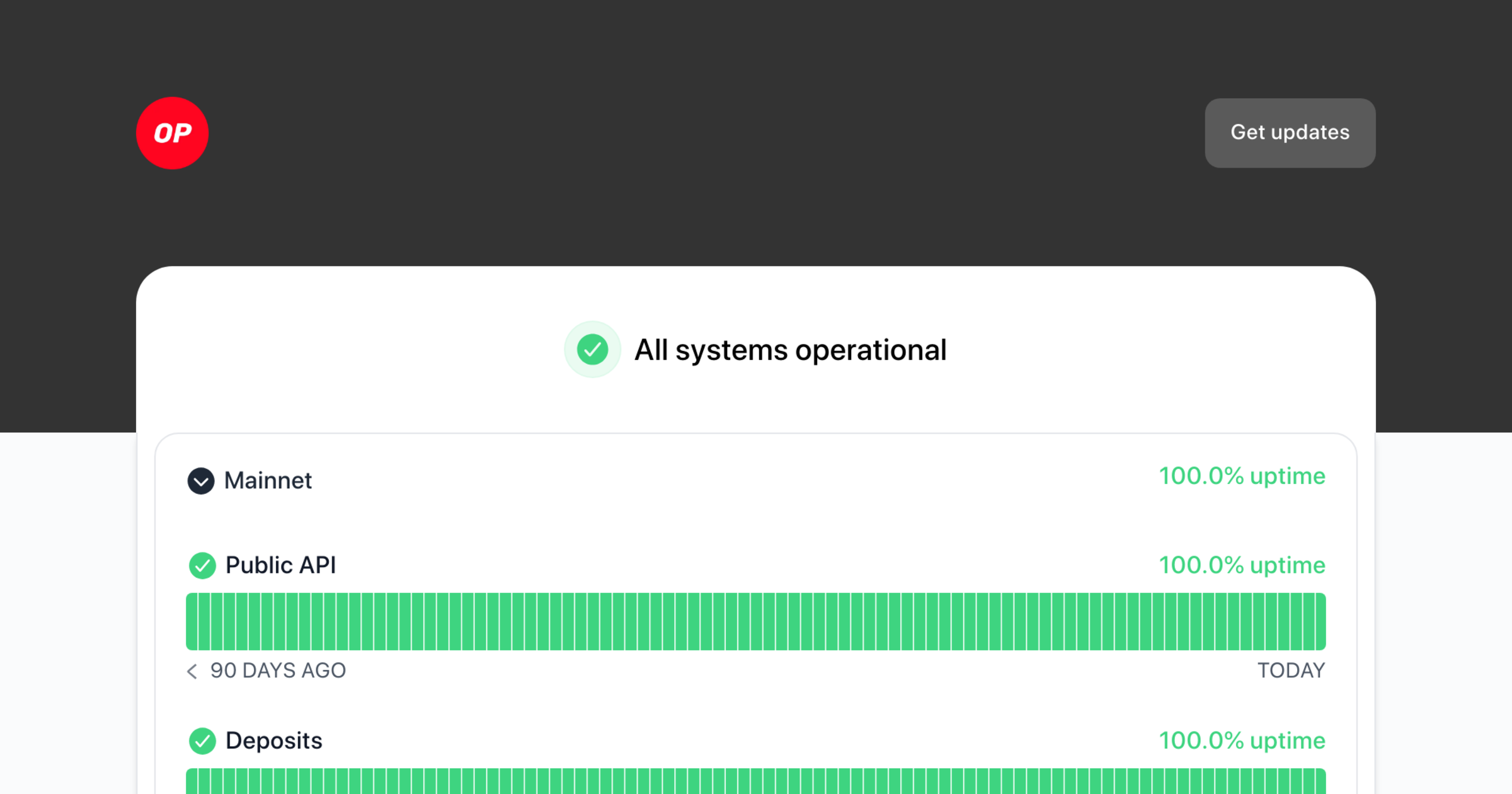 Optimism - Status Optimism - Status Page Get updates Email Slack Microsoft Teams Google Chat Webhook RSS Atom API Get updates Dark mode All systems operational Collapse group Mainnet 100% - uptime 100.0% uptime Public API - Operational Public API 100% - uptime 100.0% uptime Read uptime graph for Public API Full History 90 days ago Today Bridge UI - Operational Bridge UI 100% - uptime 100.0% uptime Read uptime graph for Bridge UI Full History 90 days ago Today Deposits - Operational Deposits 100% - uptime 100.0% uptime Read uptime graph for Deposits Full History 90 days ago Today Withdrawals - Operational Withdrawals 100% - uptime 100.0% uptime Read uptime graph for Withdrawals Full History 90 days ago Today Transaction Sequencing - Operational Transaction Sequencing 100% - uptime 99.99% uptime Read uptime graph for Transaction Sequencing Full History 90 days ago Today Batch Submission...