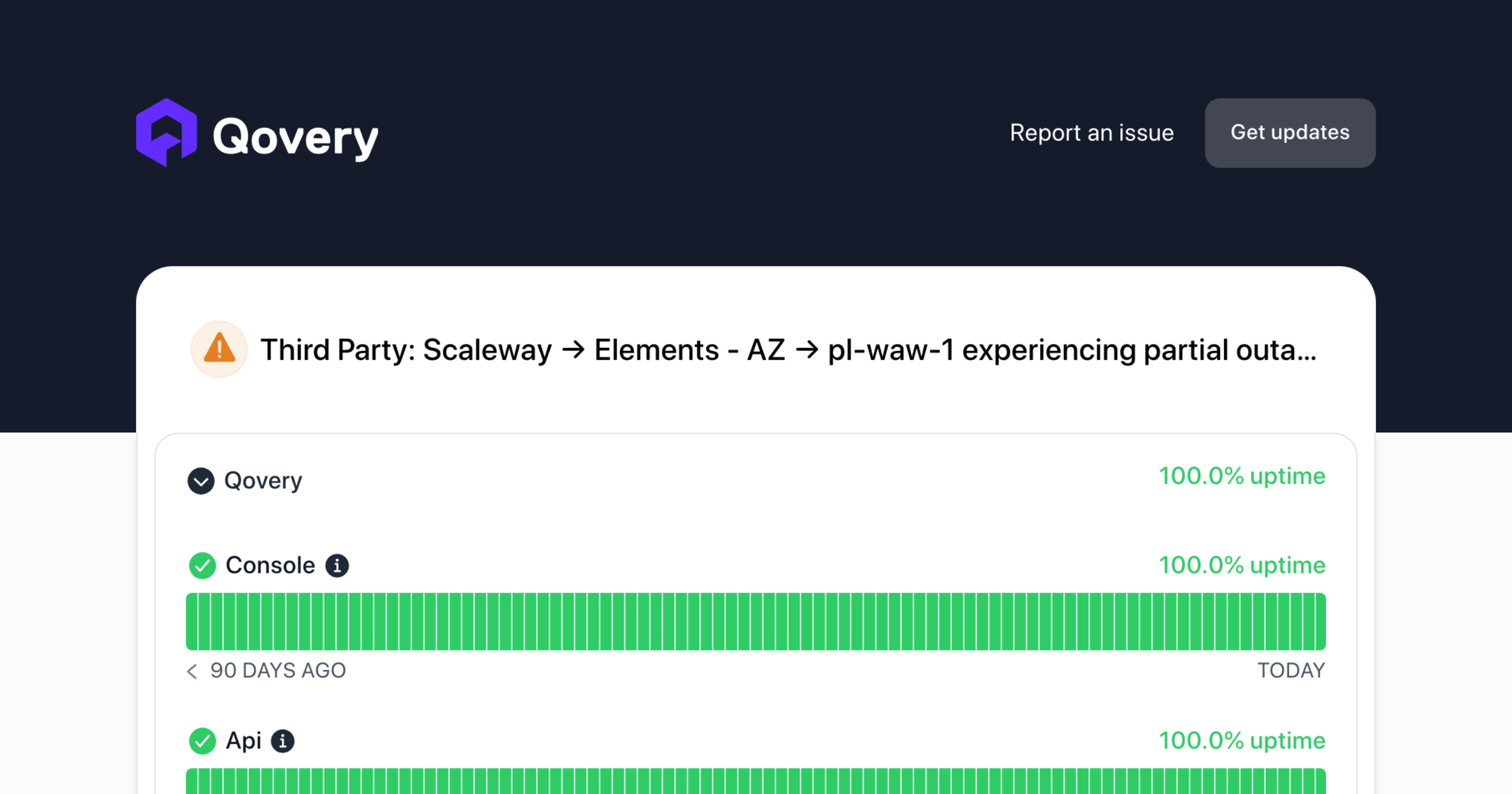 Qovery - Status Qovery - Status Page Report an issue Get updates Email Slack Microsoft Teams Google Chat Webhook RSS Atom API Report an issue Get updates Dark mode Customer infratructure experiencing partial outage Collapse group Qovery 100% - uptime 99.94% uptime Console - Operational Console 100% - uptime 100.0% uptime Read uptime graph for Console Notice history 90 days ago 90 days ago Today Api - Operational Api 100% - uptime 100.0% uptime Read uptime graph for Api Notice history 90 days ago 90 days ago Today Environment deployment - Operational Environment deployment 100% - uptime 100.0% uptime Read uptime graph for Environment deployment Notice history 90 days ago 90 days ago Today Infrastructure deployment - Operational Infrastructure deployment 100% - uptime 100.0% uptime Read uptime graph for Infrastructure deployment Notice history 90 days ago 90 days ago Today Emails - Operational E...