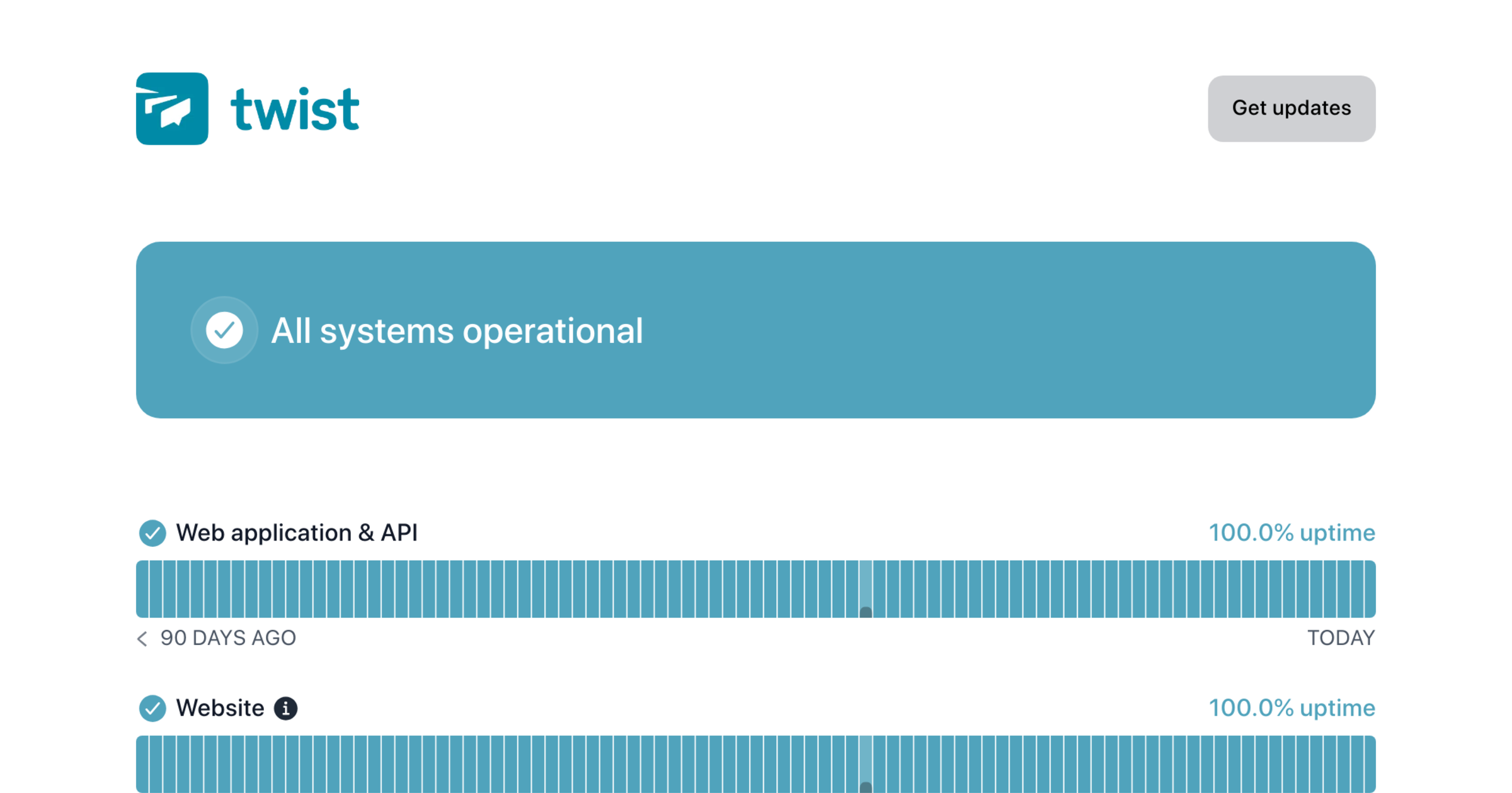Twist - Status Twist - Status Page Get updates Email Slack Microsoft Teams Google Chat Webhook RSS Atom API Get updates Dark mode All systems operational Web application & API - Operational Web application & API 100% - uptime 100.0% uptime Read uptime graph for Web application & API Full History 90 days ago Today Website - Operational Website 100% - uptime 100.0% uptime Read uptime graph for Website Full History 90 days ago Today Recent notices No notices reported for the past 7 days Show notice history Show notice history Powered by Instatus