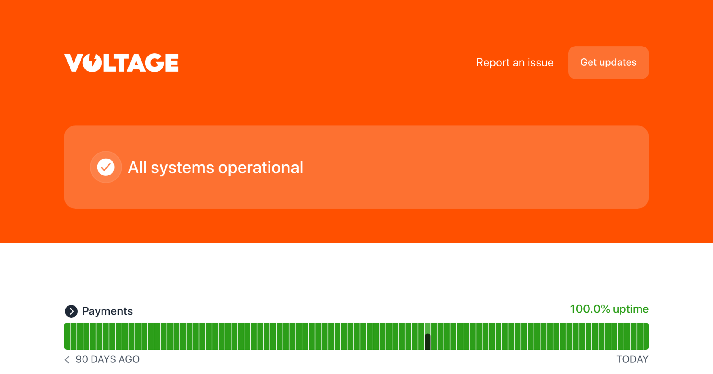 Voltage - Status Voltage - Status Page Report an issue Get updates Email Slack Microsoft Teams Google Chat Webhook RSS Atom API Report an issue Get updates All systems operational Expand group Websites 100% - uptime 100.0% uptime Read uptime graph for undefined Full History 90 days ago Today Expand group Lightning Nodes 100% - uptime 100.0% uptime Read uptime graph for undefined Full History 90 days ago Today Expand group Surge 100% - uptime 100.0% uptime Read uptime graph for undefined Full History 90 days ago Today Expand group BTCPay Servers 100% - uptime 100.0% uptime Read uptime graph for undefined Full History 90 days ago Today Expand group Flow 100% - uptime 100.0% uptime Read uptime graph for undefined Full History 90 days ago Today Recent notices No notices reported for the past 7 days Show notice history Show notice history Powered by Instatus