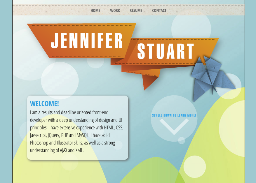 Front End Web Developer – Jennifer Stuart Jennifer Stuart - Online Portfolio Jennifer Stuart - Front End Web Developer Home Work Resume Contact Welcome! I am a results and deadline oriented front-end developer with a deep understanding of design and UI/UX principles. I have extensive experience with HTML, CSS, Javascript, JQuery, PHP and MySQL. I have many years of experience with Photoshop and Illustrator, along with great communication skills, and a scrupulous attention to detail. My Work « older Client: Laney Walker Bethlehem / Meleaver-McIntosh Created HTML/CSS from Photoshop files. Created custom WordPress theme based on HTML files. Added newsfeed scroller to homepage. Implemented and customized video player (TubePress) and photo gallery (NextGen Gallery). Created custom templates that used multiple content editor panels in the WordPress admin. Skills: HTML, CSS, PHP, Javascript/jQuery, WordPress http://www.laneywalkerbethlehem.com Client: Roseview G...
