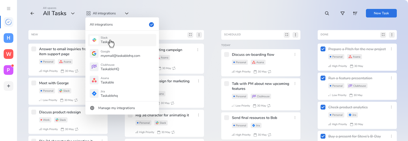 Taskable | Integrated tasks, calendar and timeblocking Features Integrations Pricing Use Cases Blog Login Sign Up Lost control? Time to take it back. Manage your top priorities with a personal, unified to-do list and calendar. Get set up in minutes! Start Your Free Trial Take back control of your day Join the thousands of other founders, freelancers, makers and many-hat wearers using Taskable to stay focused on their top priorities Try Taskable! I'm not saying Taskable has changed my life, but I will say I've gotten more of my to-do list done (for both work and personal tasks) this week than I have in a while... so yes, it might be changing my life! Brittany Joiner , Frontend Developer , Elastic I just wanted to say thank you! I was looking at my list of 70 todo items on my Todoist and I was feeling a little stressed. But then I started dividing it up by day into the scheduled view and now it all feels doable! This feels like a game-changer! Joe...