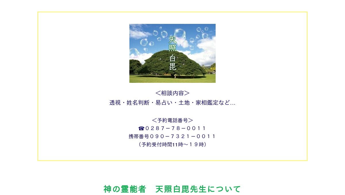 天照白毘 <相談内容> 透視・姓名判断・易占い・土地・家相鑑定・恋愛・結婚・仕事・病気のことなど、ありとあらゆる相談に応じます。 <予約問い合わせ先> 【電話番号】0287-78-0011 【携帯番号】090-7321-0011 【メールアドレス】 hakubi0011@gmail.com (予約受付時間11時~19時) 神の霊能者 天照白毘先生について 伊勢神宮に参拝の際に、突然神様の声が聞こえ、51歳で霊能者としてデビュー。 神様の言葉を伝え、人々の人生を的中させます。透視・姓名判断・易占い・土地と家相鑑定などありとあらゆる相談に応じます。 また、Facebookに日々のことを投稿しています。どうぞ、ご覧ください。 ☆天照白毘先生の掲載された雑誌☆ ◎イギリス生活情報誌月刊 ミスター・パートナー2016ヒットの予感 ◎躍進企業応援マガジン カンパニータンク 2019年 1月号 電話相談承ります。 令和3年1月より、30分5000円で電話相談行います。 (令和2年12月までは、20分3000円) ☆令和3年1月13日から1月14日まで、北海道旭川市に出張に行きます。 相談ご希望の方は、お電話ください。 相談料は、お祓い付き1時間10,000円となります。 気功をご希望の方は、事前のご連絡をお願いします。 皆様にお会いできるのを楽しみにしています。 ♪栃木県那須町でお店を 開いています♪ 「Dieux(デュー)の庭)」 ・パワーストーン・雑貨・洋服など 可愛いものがたくさんあります。 住所 栃木県那須郡那須町高久丙 1195-163 ⭐︎パワーストーンの通販始めました⭐︎ https://dieuxnoniwa.shopselect.net/ ☆令和3年1月13日から1月14日まで、北海道旭川市に出張に行きます。 相談ご希望の方は、お電話ください。 相談料は、お祓い付き1時間10,000円となります。 気功をご希望の方は、事前のご連絡をお願いします。 皆様にお会いできるのを楽しみにしています。 一人ひとりの幸せを願う 神の言葉と力で、...