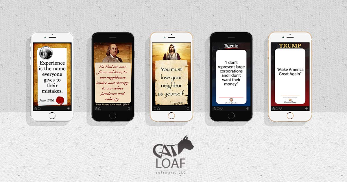 Texts From Apps Toggle navigation Texts From Apps About Jesus Founding Fathers Bernie Wilde Contact Texts From Apps Daily Quotes From Historical Figures Daily Texts From Historical and Political Figures The free “Texts From” applications for iPhone, iPad, Apple Watch and Android give you access to collections of themed quotes. A new daily quote gets sent to your device every day, and can be easily shared with your friends. Texts From Jesus Who hasn’t wanted to hear from Jesus once in awhile? How about every day? Now you can, and not just in the King James version but also as Modern English. All messages come from the New Testament, as well as optionally from some gnostic texts such as the Gospel of Thomas. Texts From Founding Fathers Get daily tidbits of wisdom and historical knowledge from the Founding Fathers of the USA! Hundreds of quotes from George Washington, Benjamin Franklin, Thomas Jefferson, Thomas Paine, John Adams, Alexander Hamilton,...