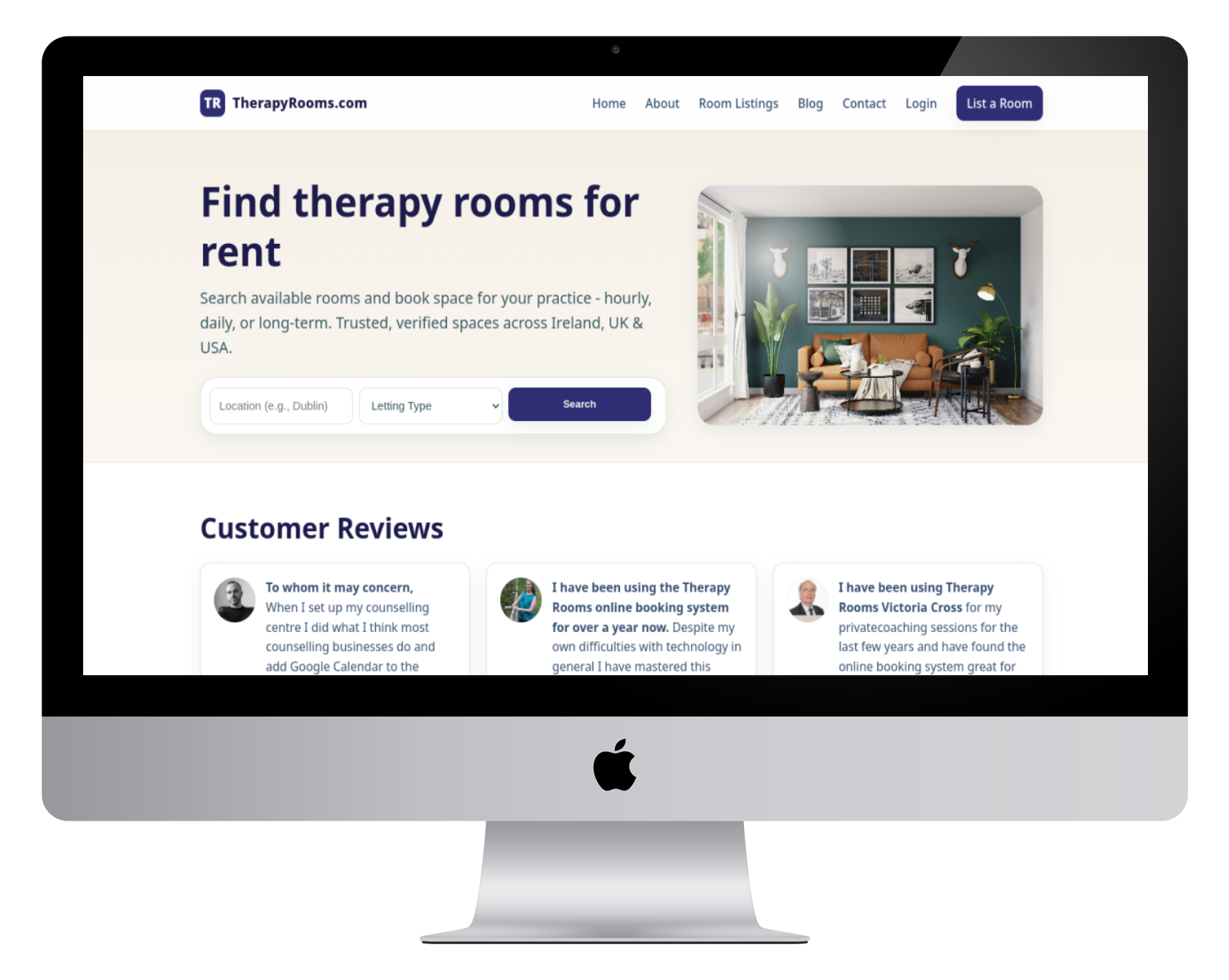 Therapy Rooms - Bringing People Together IE IE EN AU About us Therapy Rooms Room Renters Blog Add a Room Listing Room referrals in your location Pricing Site Help Join our Facebook Group FAQ & Links Contact Login Home About us Room Listings Therapy Rooms Room Renters Therapists Find Therapists Find Clients Blog Contact Login For Room Owners For Room Owners Search for Therapy Rooms Add a Room Listing Room referrals in your location Pricing Site Help Join our Facebook Group FAQ & Links Before we proceed, Please answer one of the following Are you renting on a monthly or yearly basis? OR Are you renting on an hourly or daily basis ? If your unsure you can reach out to us using one of the links below Tick here to auto-load your listing with mock content ? ? I'm a room renter Get Started I'm a room owner Get Started SHORT TERM ROOMS Hourly...