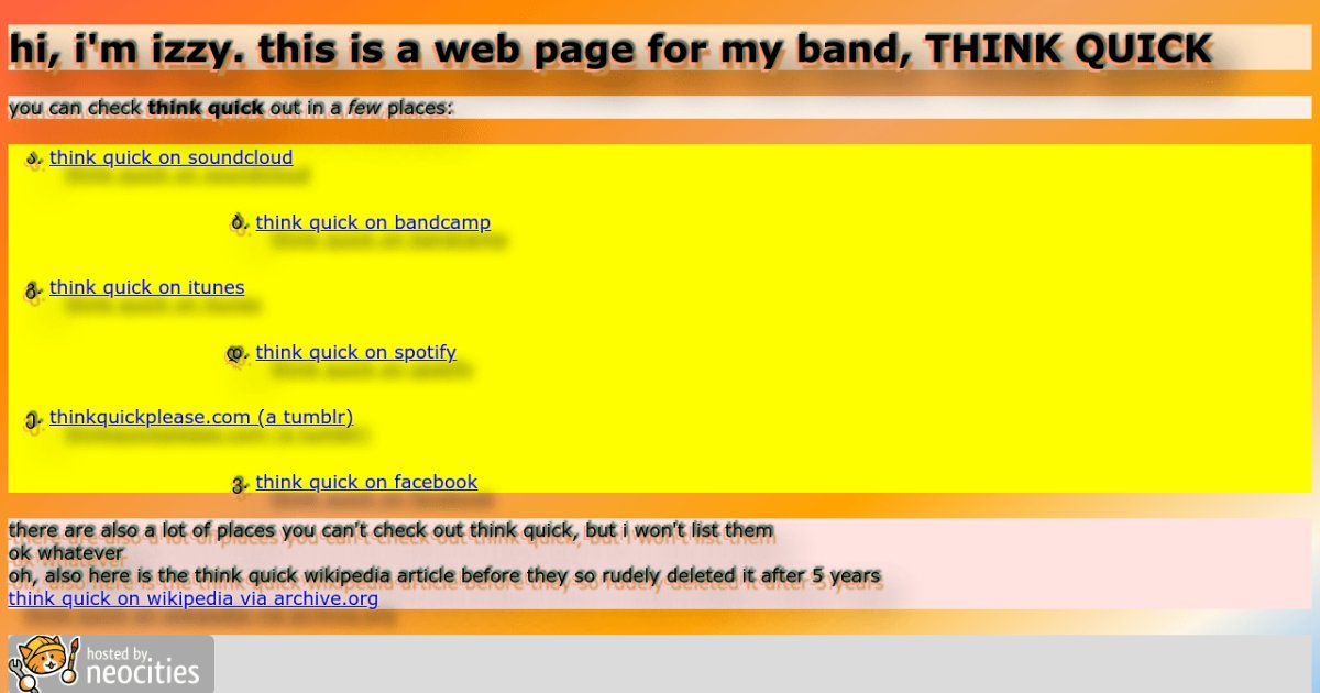 think quick (an indie pop chiptune band) hi, i'm izzy. this is a web page for my band, THINK QUICK you can check think quick out in a few places: think quick on soundcloud think quick on bandcamp think quick on itunes think quick on spotify thinkquickplease.com (a tumblr) think quick on facebook there are also a lot of places you can't check out think quick, but i won't list them ok whatever oh, also here is the think quick wikipedia article before they so rudely deleted it after 5 years think quick on wikipedia via archive.org (neocities is pretty cool, so i'm displaying their banner) you're not supposed to read this part but i guess it's ok π