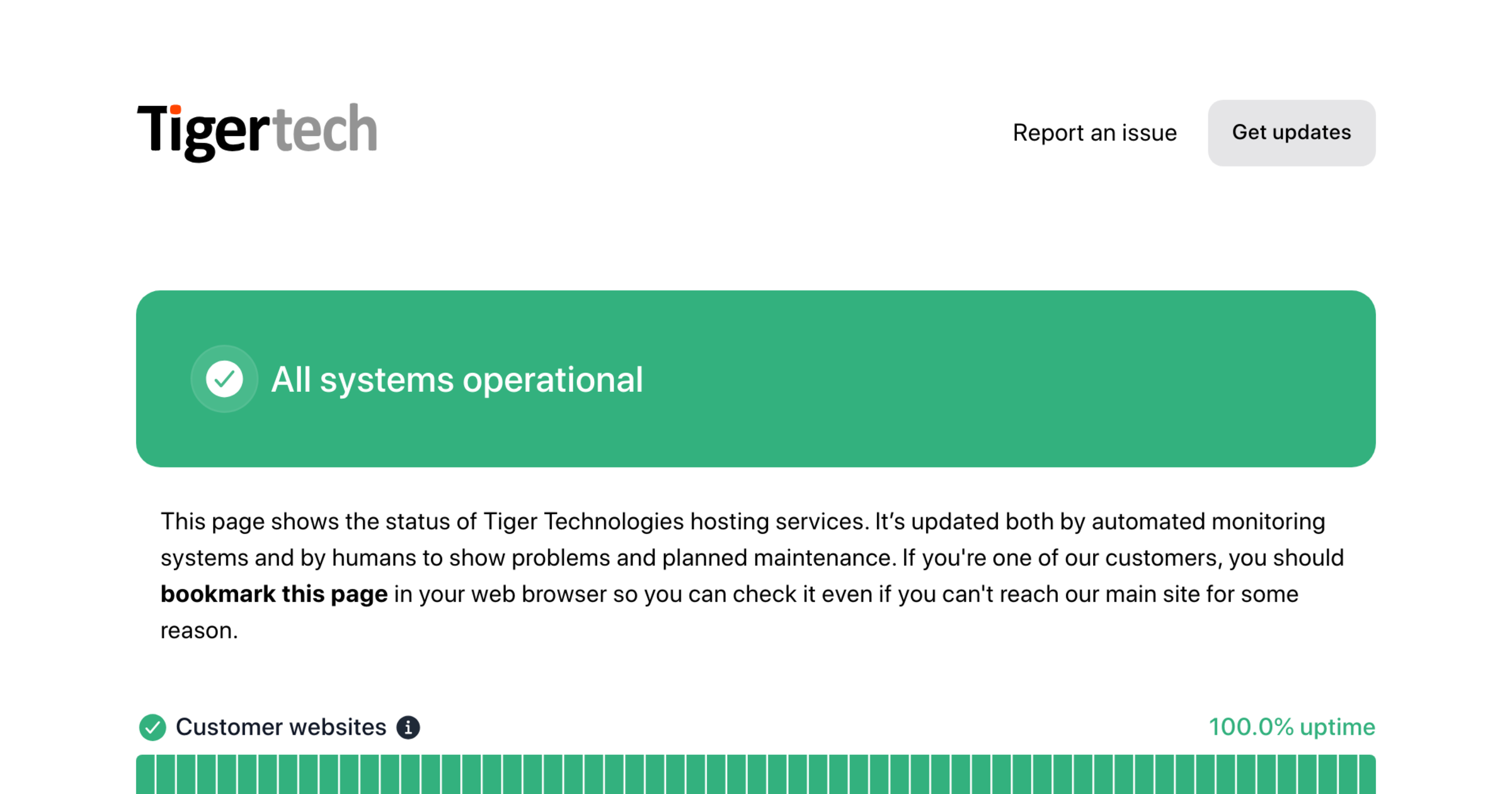Tiger Technologies - Status Report an issue Get updates Email Slack Microsoft Teams Google Chat Webhook RSS Atom API Report an issue Get updates All systems operational This page shows the status of Tiger Technologies hosting services. It’s updated both by automated monitoring systems and by humans to show problems and planned maintenance. If you're one of our customers, you should bookmark this page in your web browser so you can check it even if you can't reach our main site for some reason. Customer websites 100.0 % uptime 60 days ago Today Incoming email 100.0 % uptime 60 days ago Today Outgoing email 100.0 % uptime 60 days ago Today webmail 100.0 % uptime 60 days ago Today DNS 100.0 % uptime 60 days ago Today tigertech.net website 100.0 % uptime 60 days ago Today Recent notices No notices reported for the past 7 days Show notice history Show notice history Powered by Instatus
