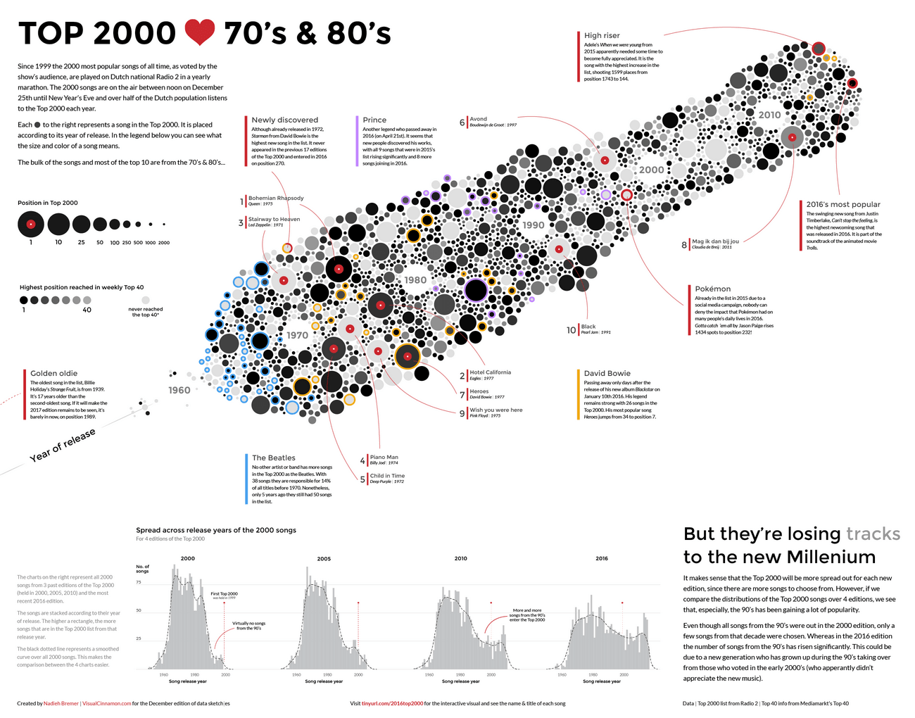 The Top 2000 Loves the 70s & 80s TOP 2000 ❤ the 70's & 80's Each year since 1999 the 2000 most popular songs of all time, as voted by the show's audience, are played on Dutch national Radio 2. The 2000 songs are on the air between noon on December 25th until New Year's Eve and over half of the Dutch population listens to the Top 2000 each year. Each ⬤ below represents a song in the Top 2000. It is placed according to its year of release. Check out the more elaborate poster of this visual (or the Dutch version ) to understand what the different colors surrounding a song mean ( The Beatles , David Bowie , Prince & Special songs ) & to get more background information on this year's edition and the trend over the last 17 years. Each ⬤ in the image below represents a song in the Top 2000. It is placed according to its year of release. Click on the image below to go to a big version of the visual and see the details (or go to the Dutch version ) to get more background inf...