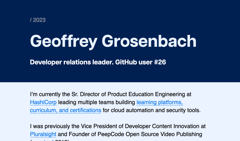 Geoffrey Grosenbach - Topfunky Blog / 2023 Geoffrey Grosenbach Developer relations leader. GitHub user #26 I’m currently the Director of Education Engineering and Certifications at Datadog . I was previously the Sr. Director of Product Education Engineering at HashiCorp leading multiple teams building learning platforms, curriculum, and certifications for cloud automation and security tools. Before that, the Vice President of Developer Content Innovation at Pluralsight and Founder of PeepCode Open Source Video Publishing ( acquired 2013). Contact 📥 boss@topfunky.com 🌎 Seattle, WA USA GitHub · LinkedIn · Mastodon · Dribbble · Instagram Recent articles 5 Feb 2023 24 Jan 2023 28 Dec 2022 21 Jan 2021 3 Jan 2021 6 Dec 2020 19 Oct 2020 16 May 2020 19 Feb 2019 26 Aug 2018 1 Sep 2016 Rendered by Hugo / RSS